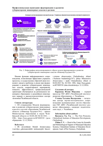 1. Об утверждении Модели формирования и развития губернаторских инженерных классов в системе образования Челябинской области (“Инженер будущего”): приказ Министерства образования и науки Челябинской области от 04.08.202 № 02/1941.- URL: https://base.garant.ru/407498539/(дата обращения: 12.12.2024).