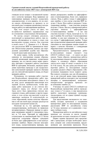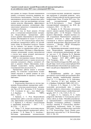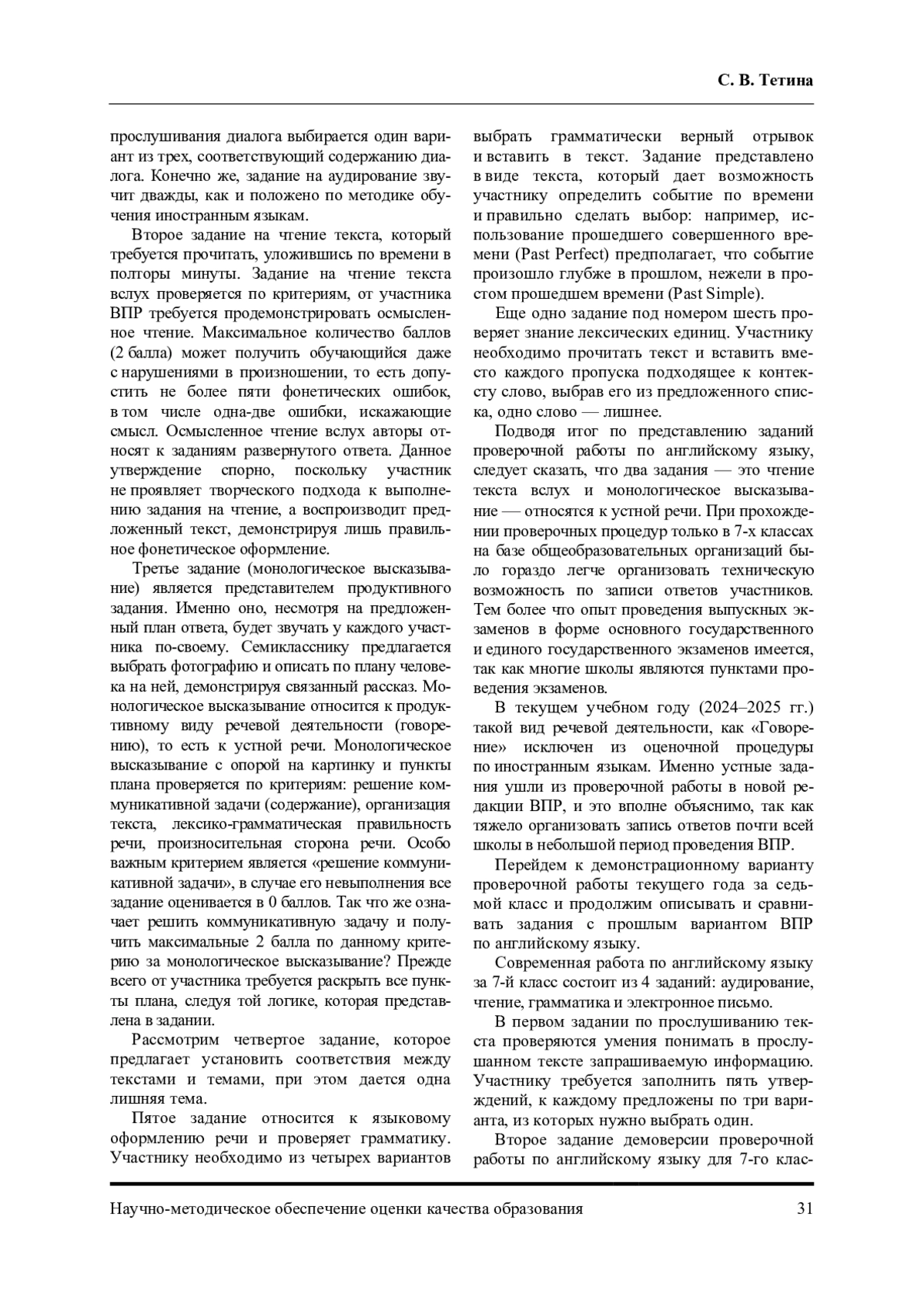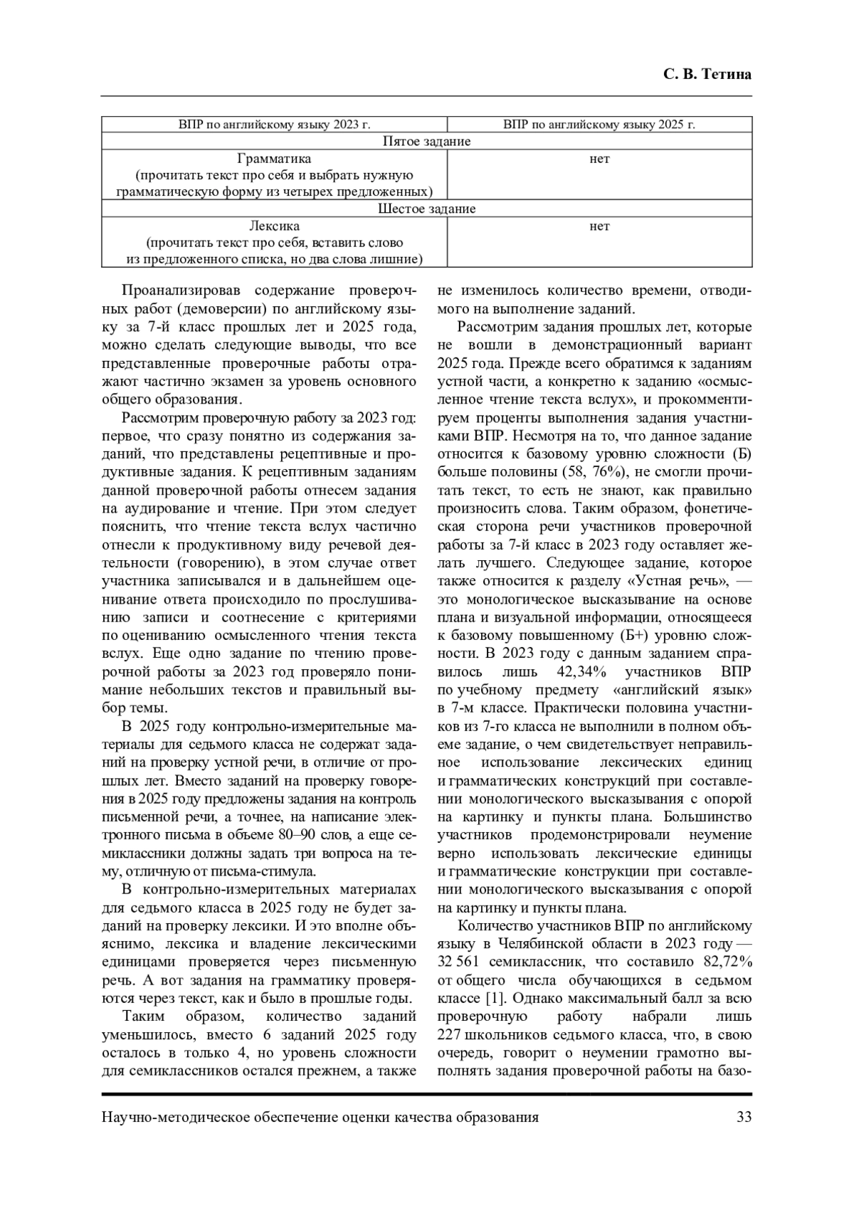 ТЕТИНА С. В. СРАВНИТЕЛЬНЫЙ АНАЛИЗ ЗАДАНИЙ ВСЕРОССИЙСКОЙ ПРОВЕРОЧНОЙ РАБОТЫ ПО АНГЛИЙСКОМУ ЯЗЫКУ 2023 ГОДА С ДЕМОВЕРСИЕЙ 2025 ГОДА // НАУЧНО-МЕТОДИЧЕСКОЕ ОБЕСПЕЧЕНИЕ ОЦЕНКИ КАЧЕСТВА ОБРАЗОВАНИЯ. 2024. № 2 (20)