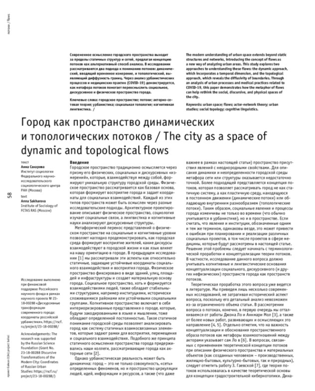 Современное осмысление городского пространства выходит за пределы статичных структур и сетей, предлагая концепцию потоков как альтернативный способ анализа. В исследовании рассматриваются два подхода к пониманию потоков: динамический, вводящий временное измерение, и топологический, выявляющий диффузность границ. Через анализ урбанистических процессов и медицинских практик (COVID-19) демонстрируется, как метафора потоков помогает переосмыслить социальное, дискурсивное и физическое пространство города.