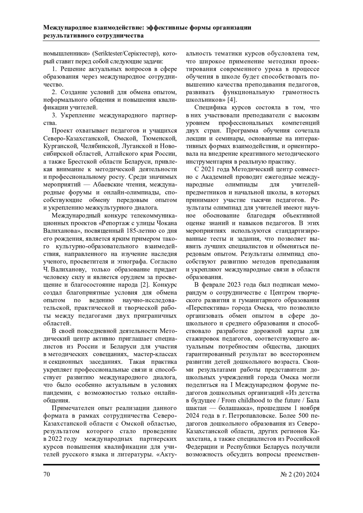 Статья посвящена итогам эффективного сотрудничества педагогических сообществ России, Казахстана и Беларуси в рамках деятельности Международного методического центра «Академия педагогического мастерства: навыки XXI века». В статье описаны значимые мероприятия, проведенные в рамках проекта «Серіктестер» - «Единомышленники». Отдельное внимание в статье уделено успешной реализации курсов повышения квалификации для учителей русского языка и литературы, проведению международных онлайн-олимпиад для учителей, в которых приняли участие более 6000 педагогов из трех стран. Важную роль в развитии международного взаимодействия играют ежегодные форумы педагогов, которые стали платформой для обсуждения качества образования, обмена идеями и лучшими практиками. В заключение статья подчеркивает важность продолжения активного сотрудничества между педагогическими сообществами трех стран. Объединенные общей целью - воспитанием достойных граждан, - учителя России, Казахстана и Беларуси продолжают развивать профессиональные навыки, обмениваться опытом и укреплять международные связи.