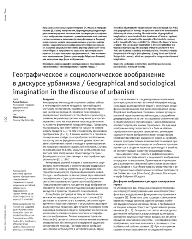 Показана взаимосвязь социологического (Ч. Миллс) и географического (Д. Харви) воображения, формирующих дискурсивную дихотомию городского планирования. Артикуляция географического воображения сопряжена с доминированием «абстрактных систем» политики и экономики (пример Докландса в Лондоне) и для горожан чревата «вненаходимостью», утратой «чувства места». Социологическое воображение обусловлено вниманием к хрупкой социальной топологии (пример Стайвесант-тауна в Нью-Йорке) и направлено на социально ориентированные проекты. Раскрыт потенциал предложенного П. Хили «совместного планирования» (Кони-стрит и верфи Габриэля в Лондоне) для интеграции двух форм воображения.