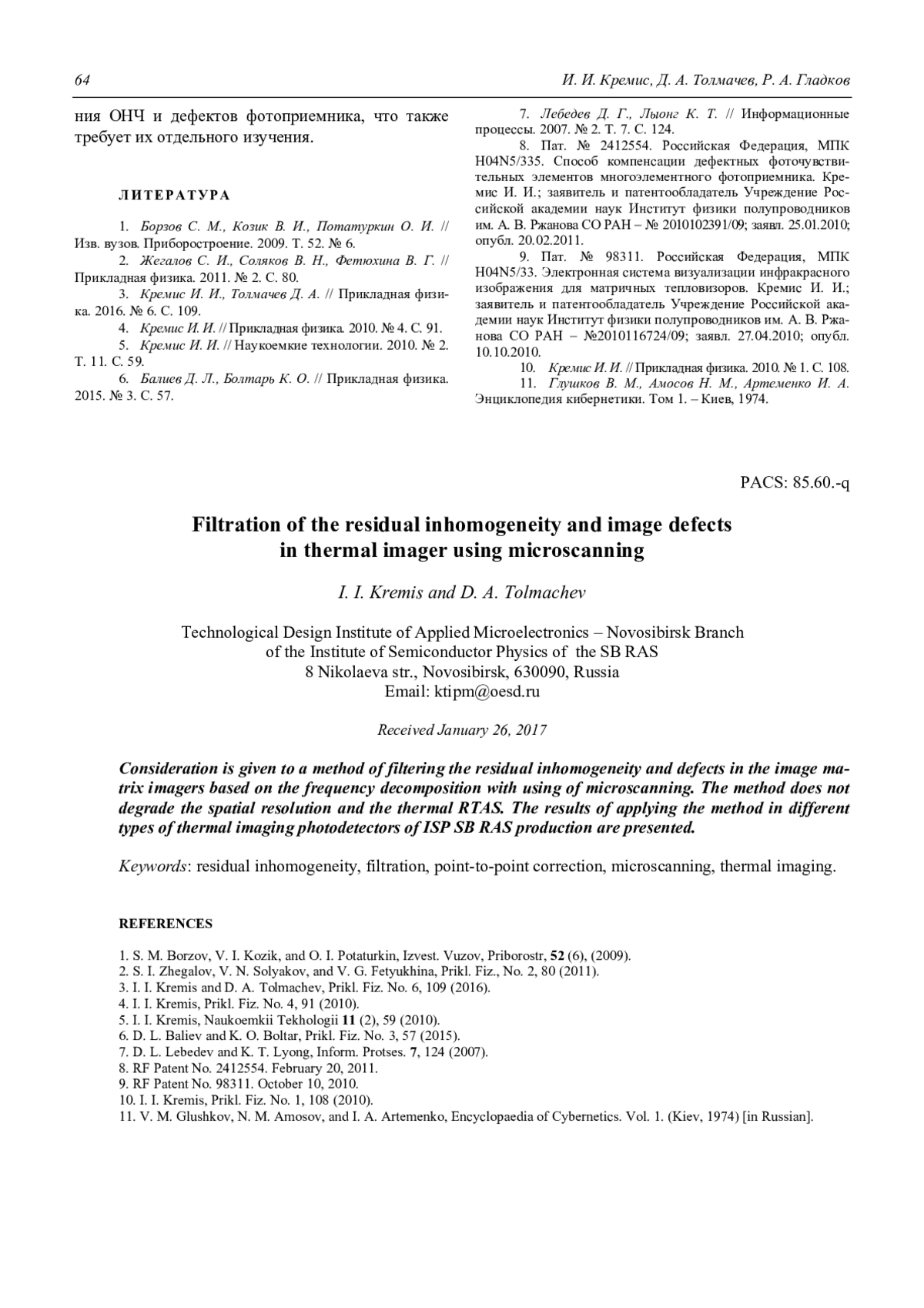 I. I. Kremis, D. A. Tolmachev, and R. A. Gladkov Filtration of the residual inhomogeneity and image defects in thermal imager using microscanning 58