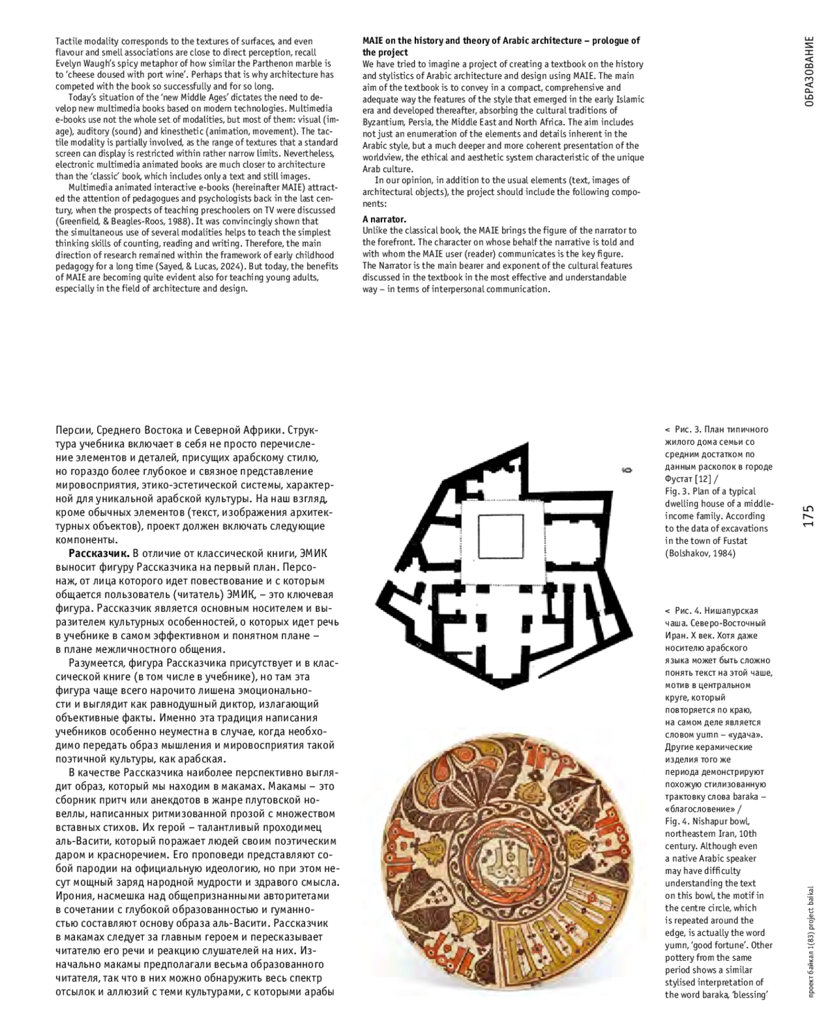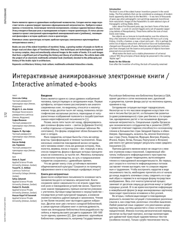 Книги являются одним из древнейших изобретений человечества. Сегодня многие люди перестают читать и демонстрируют признаки «функциональной неграмотности». Требуются новые приемы и технологии, помогающие читателю воспринимать сложные художественные образы. Этому отводится большая роль в преподавании истории и теории архитектуры. В статье рассматривается проект электронной мультимедийной анимированной книги (учебника), посвященной философии и истории арабского стиля в архитектуре.