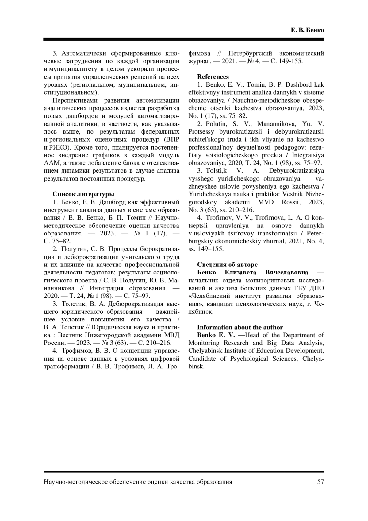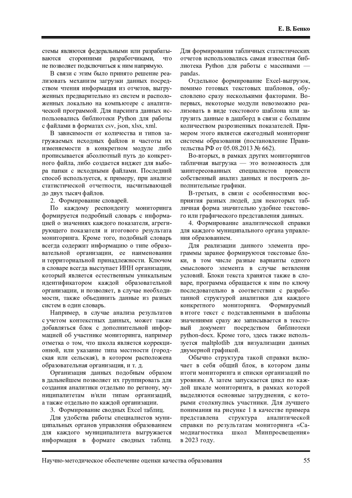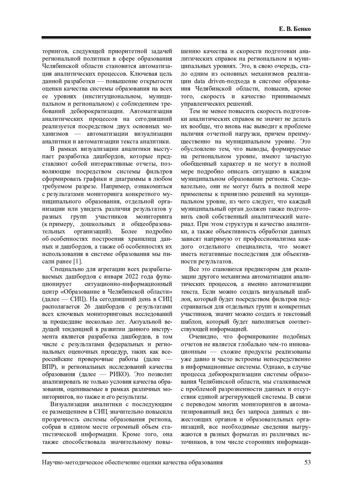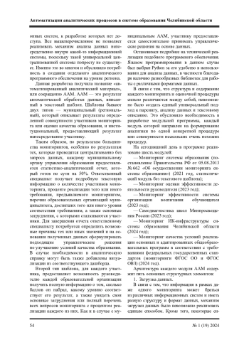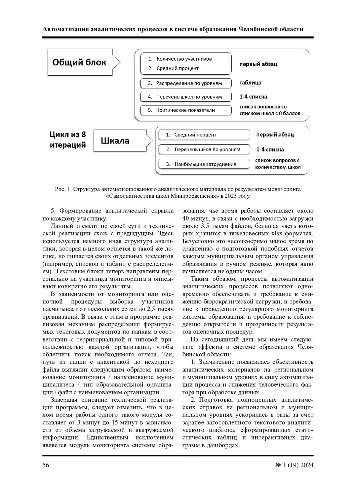 Статья описывает активно развивающийся подход Челябинской области к формированию аналитики по результатам мониторинговых исследований. В частности, представлены два механизма - автоматизация визуализации аналитики посредством дашбордов и автоматизация текста аналитики. Наиболее подробно в статье изложен механизм формирования текстовых аналитических материалов, создаваемых посредством программного обеспечения, написанного на языке Python. Описана разработка структурных элементов отдельных модулей программы и структура получаемого по результатам работы программы текстового шаблона. В заключение перечислены основные эффекты в системе образования Челябинской области, получаемые в ходе постепенной автоматизации аналитических процессов в рамках проводимых мониторинговых исследований и оценочных процедур.