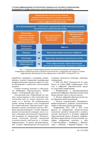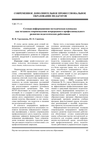 4. Уразманова. Ф. Н. Модель сетевой информационно-методической площадки как эффективный механизм сопровождения непрерывного профессионального развития педагогов в условиях цифровизации образования / Ф. Н. Уразманова, Ю. О. Савичева // Научно-методическое обеспечение оценки качества образования. - 2020. - № 3 (11). - С. 126-128. EDN: BPEGJD