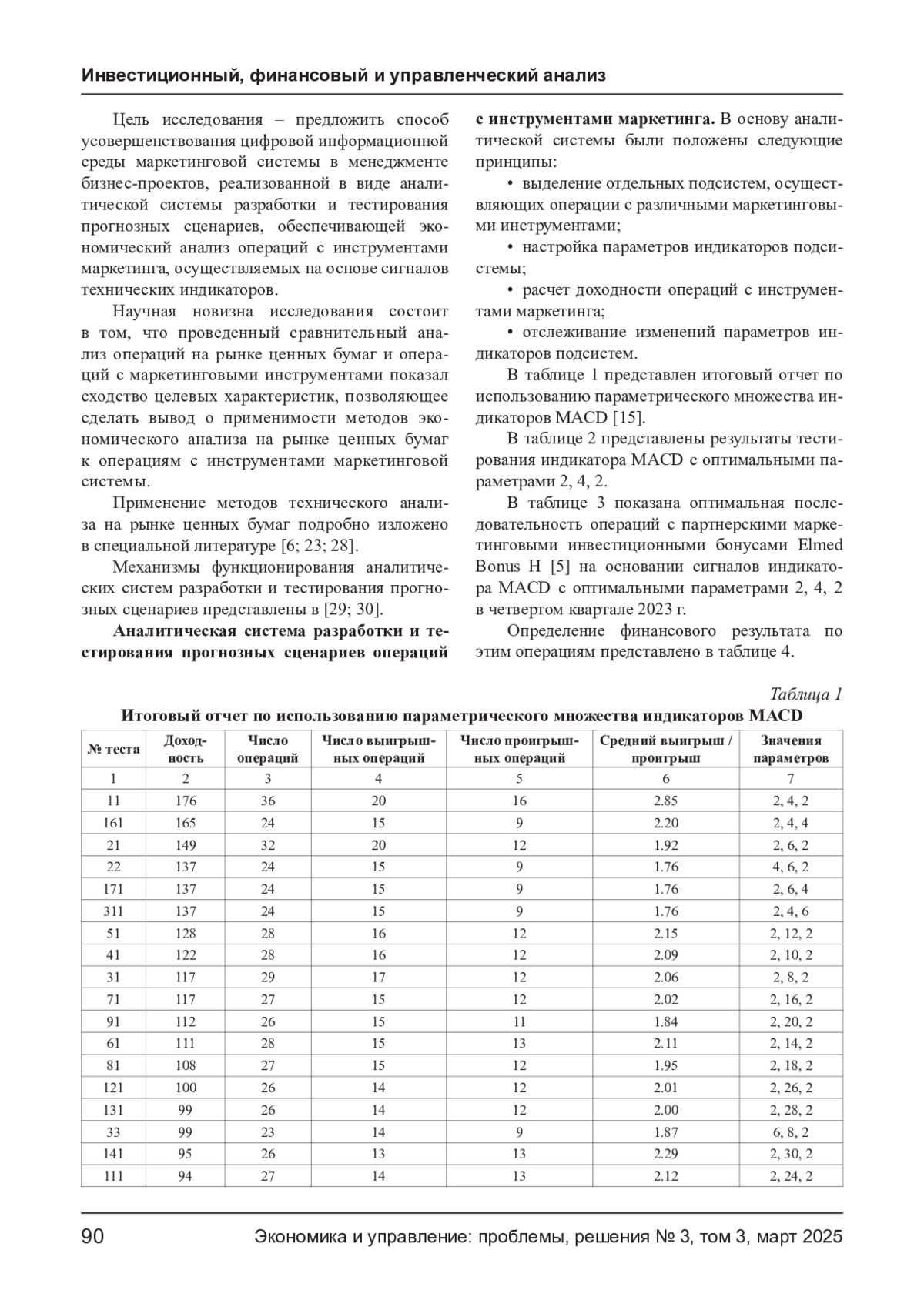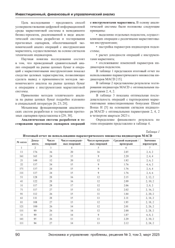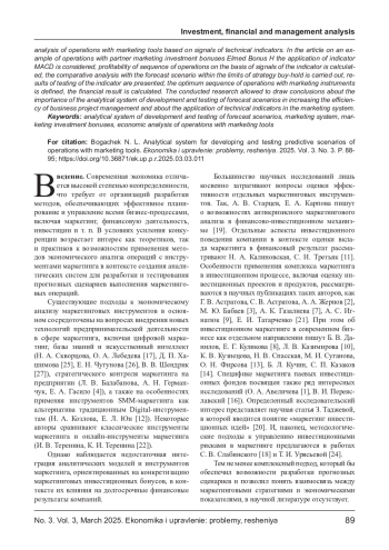 Статья посвящена разработке аналитической системы разработки и тестирования прогнозных сценариев операций с инструментами маркетинга, являющейся важнейшим компонентом цифровой информационной среды маркетинговой системы в управлении бизнес-проектами. Представленная система обеспечивает возможность проводить экономический анализ операций с маркетинговыми инструментами, осуществляемых на основе сигналов технических индикаторов. В статье на примере операций с партнерскими маркетинговыми инвестиционными бонусами Elmed Bonus H рассмотрено применение индикатора MACD, рассчитана доходность последовательности операций на основе сигналов индикатора и проведен сравнительный анализ с прогнозным сценарием в рамках стратегии «купи-держи». Представлены результаты тестирования индикатора, определена оптимальная последовательность операций с маркетинговыми инструментами, а также рассчитан финансовый результат. Проведенное исследование позволило сделать вывод о значении аналитической системы разработки и тестирования прогнозных сценариев для повышения эффективности менеджмента бизнес-проектов и о возможностях применения технических индикаторов в маркетинговой системе.