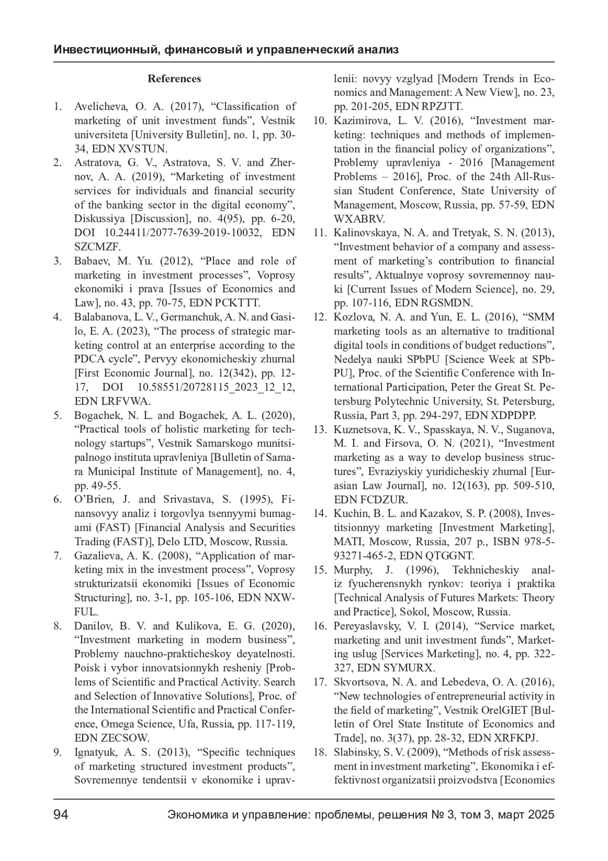 19. Старцев А. В., Карпова Е. А. Антикризисный маркетинговый анализ в финансово-инвестиционном механизме // Первый экономический журнал. - 2024. - № 2(344). - С. 80-91. DOI: 10.58551/20728115_2024_2_80 EDN: PXPNEF