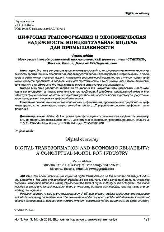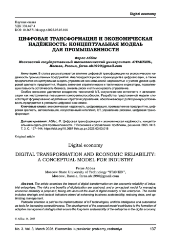 В статье рассматривается влияние цифровой трансформации на экономическую надежность промышленных предприятий. Анализируются риски и преимущества цифровизации, а также предлагается концептуальная модель управления экономической надежностью с учетом уровня цифровой зрелости предприятия. Модель включает стратегические и тактические индикаторы, позволяющие повысить устойчивость бизнеса, снизить риски и оптимизировать управление. Особое внимание уделяется внедрению технологий IoT, искусственного интеллекта и автоматизации как инструментов повышения конкурентоспособности. Разработка предложенной модели способствует формированию адаптивных стратегий управления, обеспечивающих долгосрочную устойчивость предприятия в условиях цифровой экономики.