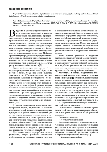 2. Васильев С. В., Николаев И. И. Интегрированная модель оценки экономической надежности предприятия в условиях цифровой трансформации // Современные проблемы экономики и управления. - 2024. - Т. 27, № 4. - С. 14-22.