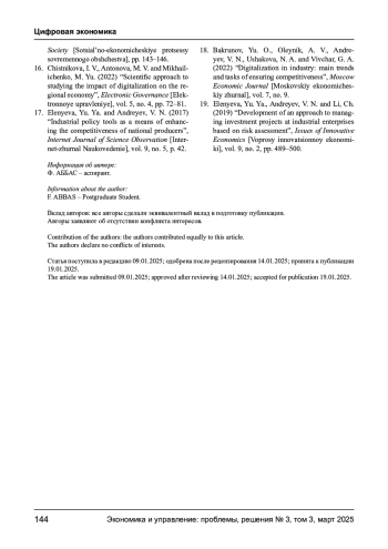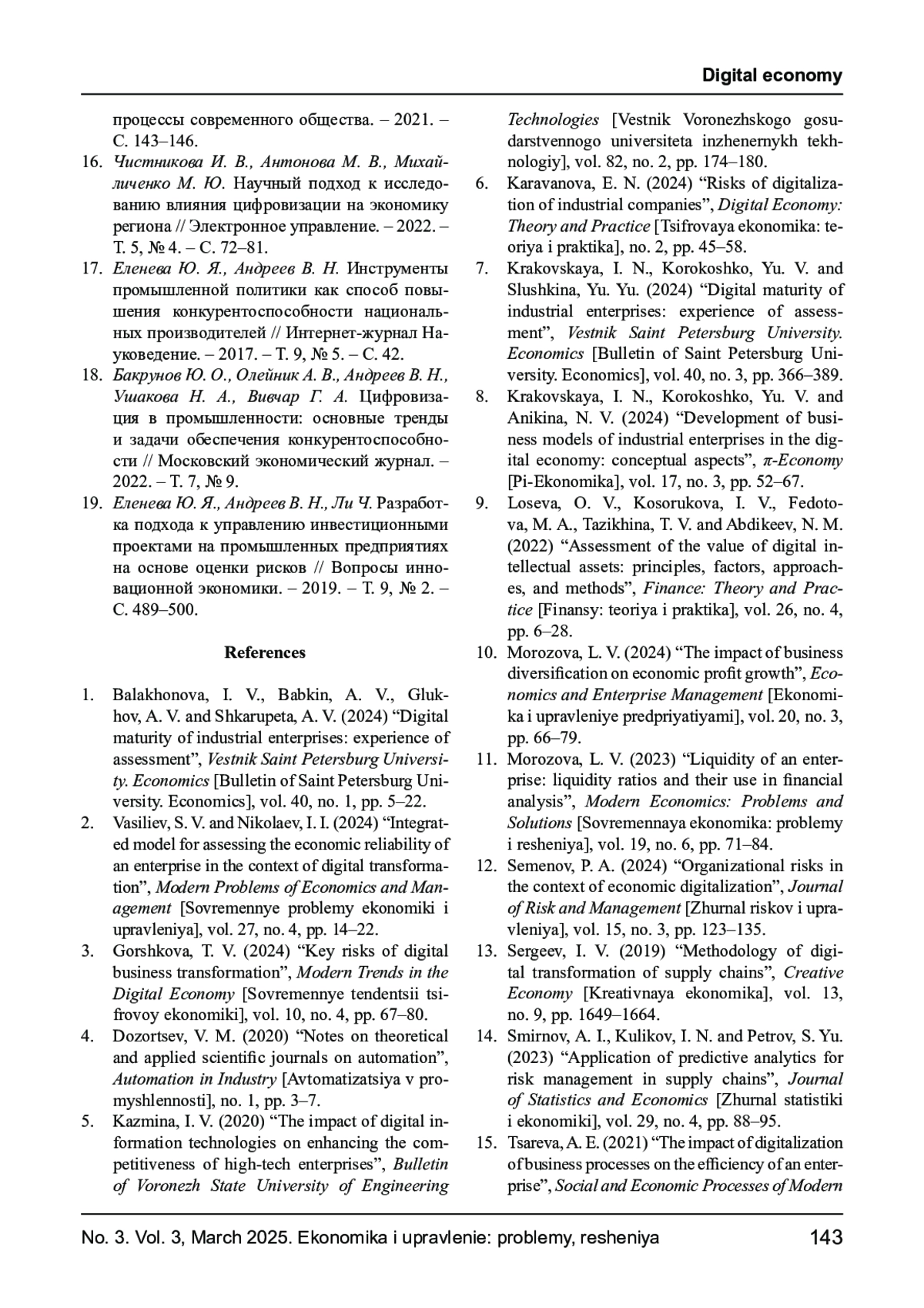 1. Балахонова И. В., Бабкин А. В., Глухов А. В., Шкарупета А. В. Цифровая зрелость промышленных предприятий: опыт оценки // Вестник Санкт-Петербургского университета. Экономика. - 2024. - Т. 40, № 1. - С. 5-22.