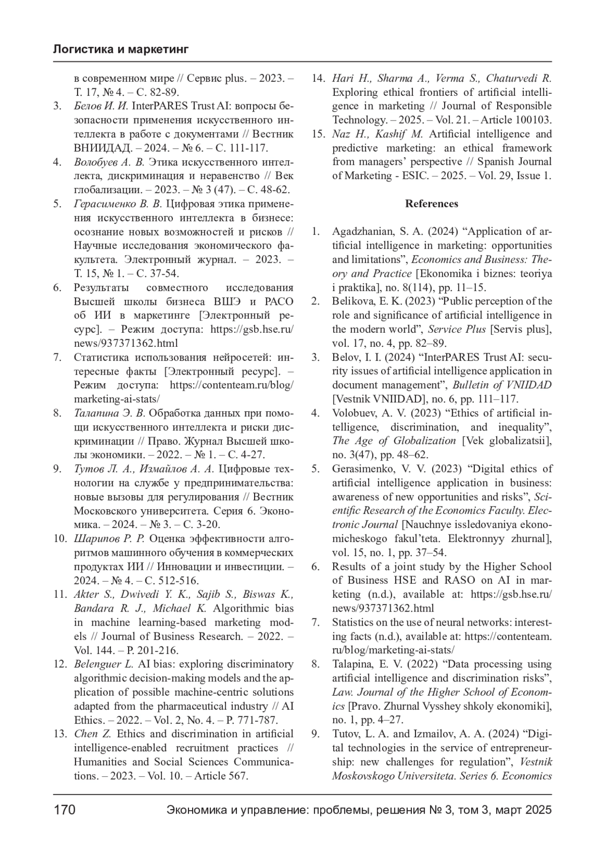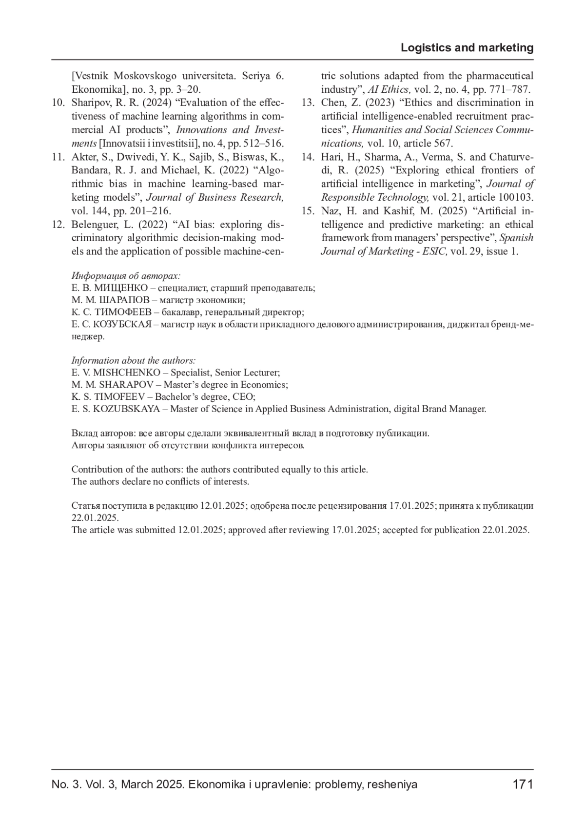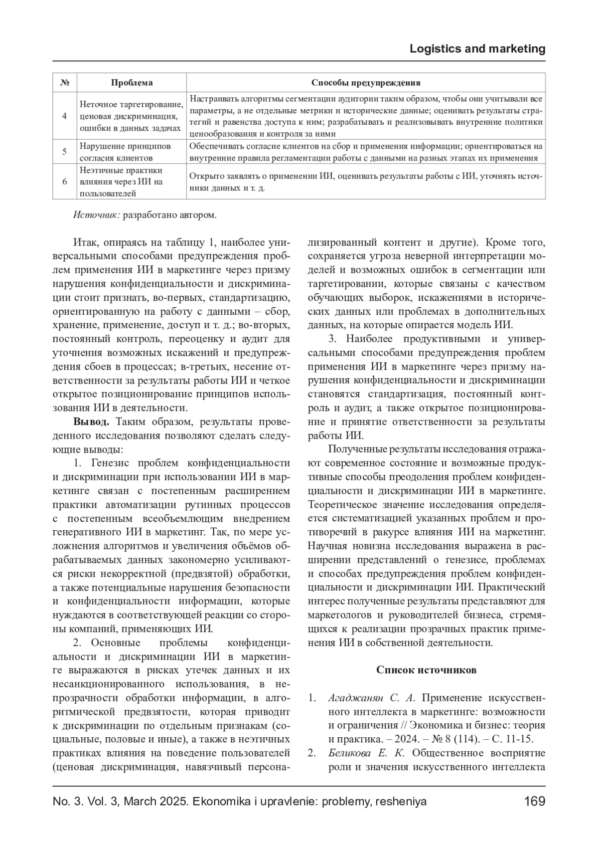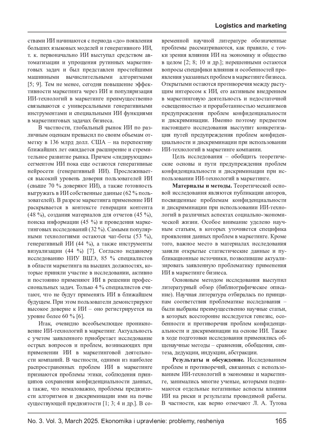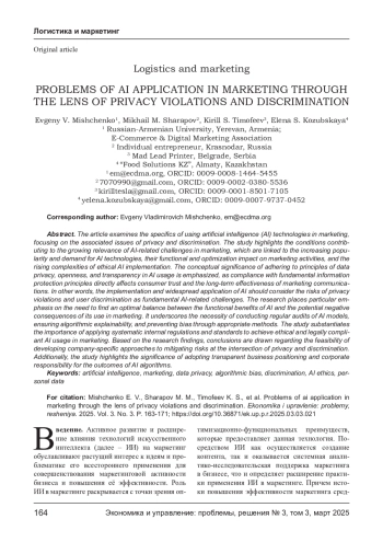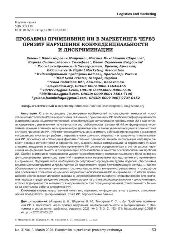 МИЩЕНКО Е. В., ШАРАПОВ М. М., ТИМОФЕЕВ К. С., КОЗУБСКАЯ Е. С. ПРОБЛЕМЫ ПРИМЕНЕНИЯ ИИ В МАРКЕТИНГЕ ЧЕРЕЗ ПРИЗМУ НАРУШЕНИЯ КОНФИДЕНЦИАЛЬНОСТИ И ДИСКРИМИНАЦИИ // ЭКОНОМИКА И УПРАВЛЕНИЕ: ПРОБЛЕМЫ, РЕШЕНИЯ. 2025. ТОМ 3 № 3