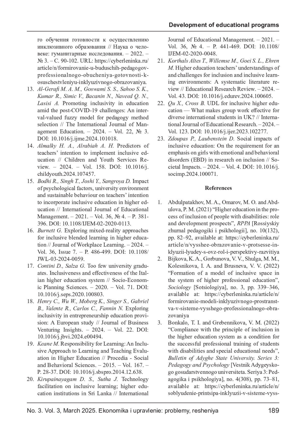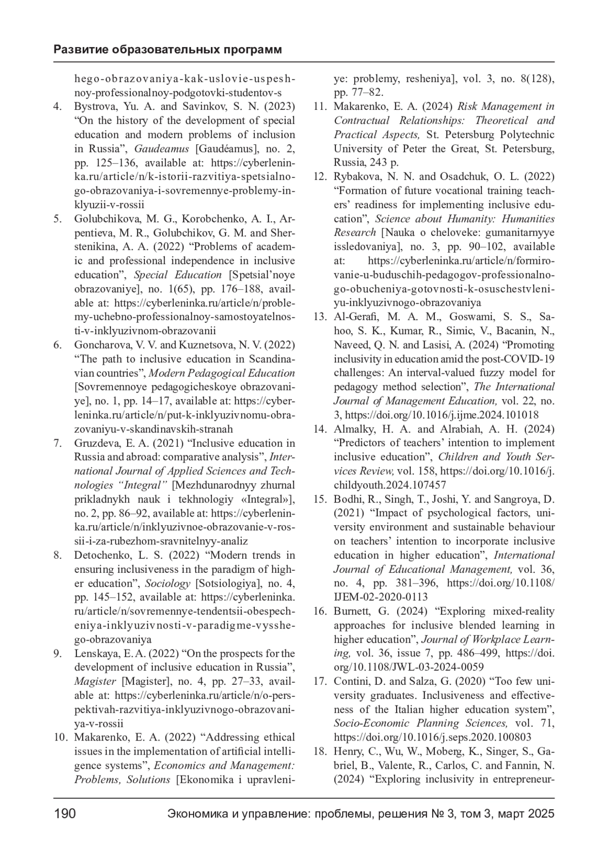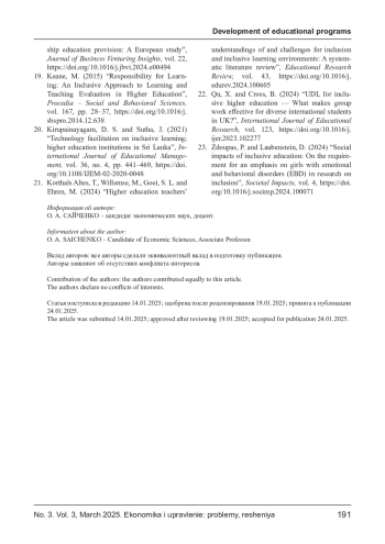 САЙЧЕНКО О. А. ИНКЛЮЗИЯ КАК ИННОВАЦИОННЫЙ ПОДХОД К УПРАВЛЕНИЮ ОБРАЗОВАТЕЛЬНОЙ ДЕЯТЕЛЬНОСТЬЮ ВЫСШИХ УЧЕБНЫХ ЗАВЕДЕНИЙ // ЭКОНОМИКА И УПРАВЛЕНИЕ: ПРОБЛЕМЫ, РЕШЕНИЯ. 2025. ТОМ 3 № 3