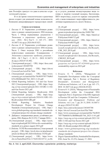 1. Евсеева О. В. Управление устойчивым развитием в рамках концептуального ESG-подхода. Часть 1. Обзор нормативных документов // Экономика и управление: проблемы, решения. - 2024. - № 6, Том V. - С. 165-171. -. DOI: 10.36871/ek.up.p.r.2024.06.05.023 EDN: PYSYUO