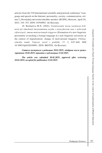 10. Бочарова М. Н. Формирование новой языковой личности при обучении иностранному языку в неязыковом вузе в условиях цифровизации: смена мотивационных триггеров // Филологические науки. Вопросы теории и практики. 2024. Т. 17, № 2. С. 635-640. DOI: 10.30853/phil20240091 EDN: BKJTOJ