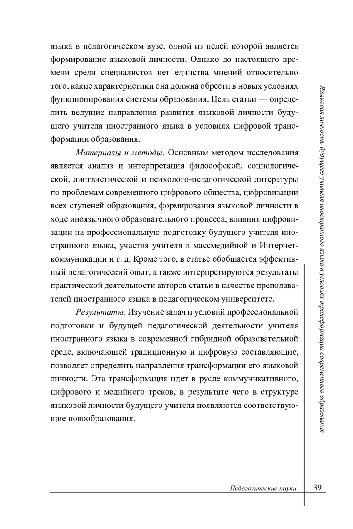 Материалы и методы. Основным методом исследования является анализ и интерпретация философской, социологической, лингвистической и психолого-педагогической литературы по проблемам современного цифрового общества, цифровизации всех ступеней образования, формирования языковой личности в ходе иноязычного образовательного процесса, влияния цифровизации на профессиональную подготовку будущего учителя иностранного языка, участия учителя в массмедийной и Интернет-коммуникации и т. д. Кроме того, в статье обобщается эффективный педагогический опыт, а также интерпретируются результаты практической деятельности авторов статьи в качестве преподавателей иностранного языка в педагогическом университете.