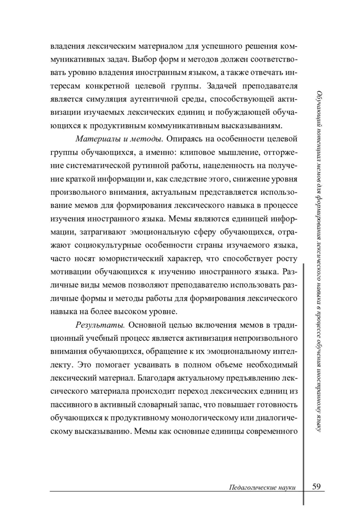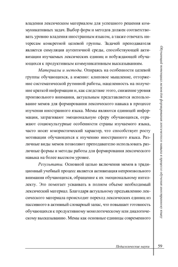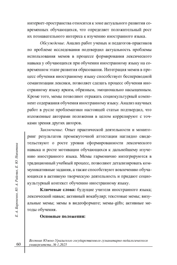 Заключение. Опыт практической деятельности и мониторинг результатов промежуточной аттестации наглядно свидетельствуют о росте уровня сформированности лексического навыка и росте мотивации обучающихся к дальнейшему изучению иностранного языка. Мемы гармонично интегрируются в традиционный учебный процесс, позволяют детализировать коммуникативные задания, а также способствуют вовлечению обучающихся в активную творческую деятельность и придают социокультурный контекст обучению иностранному языку. Основные положения: - рассмотрены этапы формирования лексического навыка и выявлены формы и методы для его успешного формирования с учетом психолого-педагогических особенностей целевой группы; - обоснована эффективность использования в традиционном учебном процессе всех видов мемов: текстовых, визуальных, мемов в видеоформате и мемов-gifts; - представлена технология внедрения мемов в традиционный процесс формирования лексического навыка.