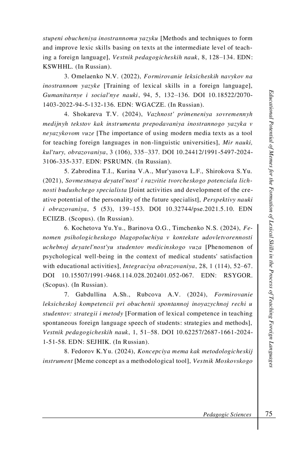 7. Габдуллина А. Ш., Рубцова А. В. Формирование лексической компетенции при обучении спонтанной иноязычной речи у студентов: стратегии и методы // Вестник педагогических наук. 2024. № 1. С. 51-58. DOI: 10.62257/2687-1661-2024-1-51-58 EDN: SEJHIK