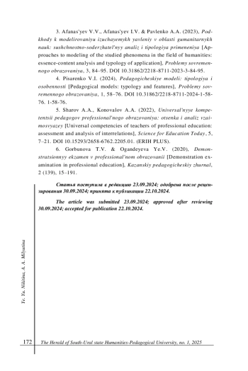 2. Мусифуллин, С. Р. Формирование медиаграмотности студентов педагогического вуза в условиях трансформации образовательного процесса / С. Р. Мусифуллин // Science for Education Today. - 2023. - Т. 13, № 1. - С. 7-27. DOI: 10.15293/2658-6762.2301.01 EDN: XJVTHE