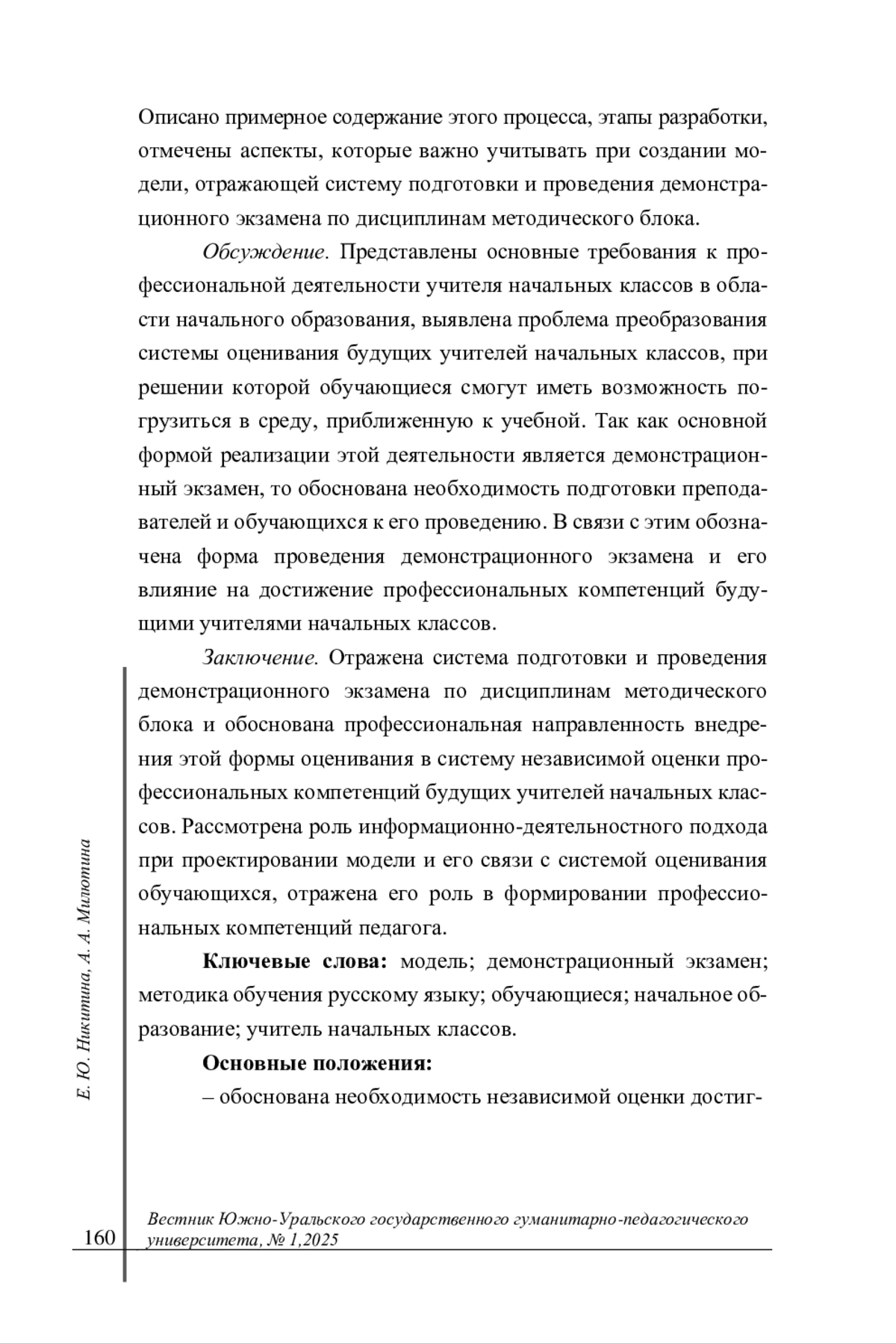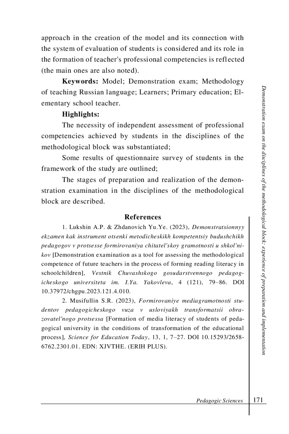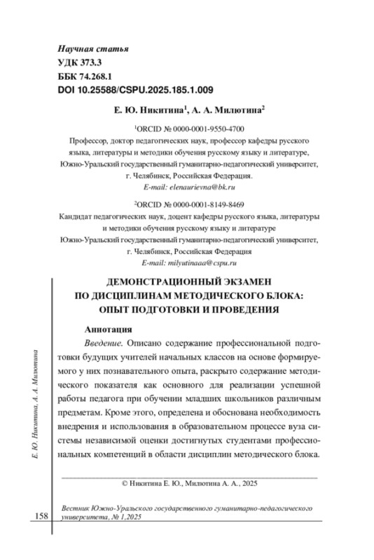 1. Лукшин, А. П., Жданович Ю. Е. Демонстрационный экзамен как инструмент оценки методических компетенций будущих педагогов в процессе формирования читательской грамотности у школьников // Вестник Чувашского государственного педагогического университета им. И.Я. Яковлева. 2023. № 4(121). С. 79-86. DOI: 10.37972/chgpu.2023.121.4.010 EDN: RPNRHV