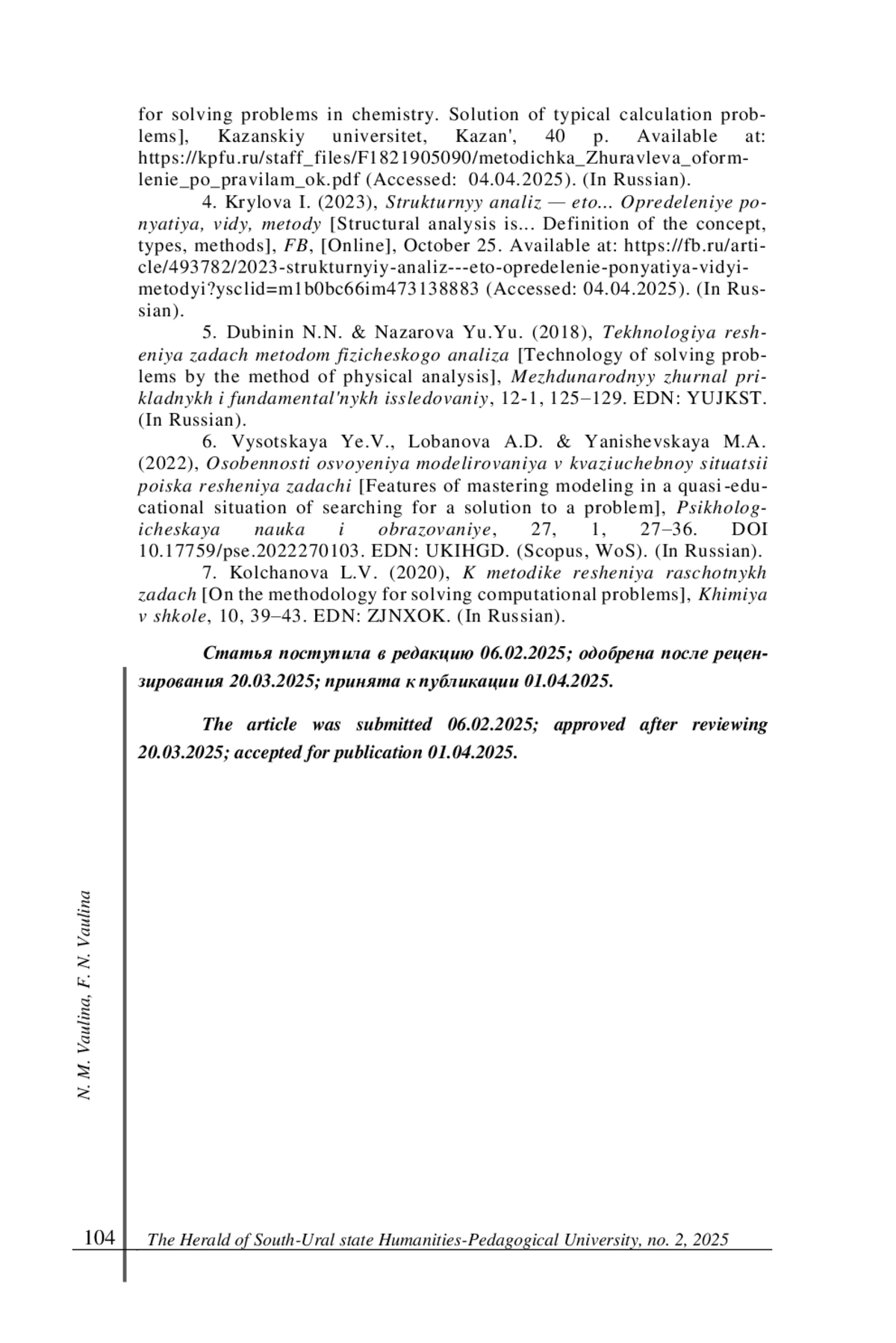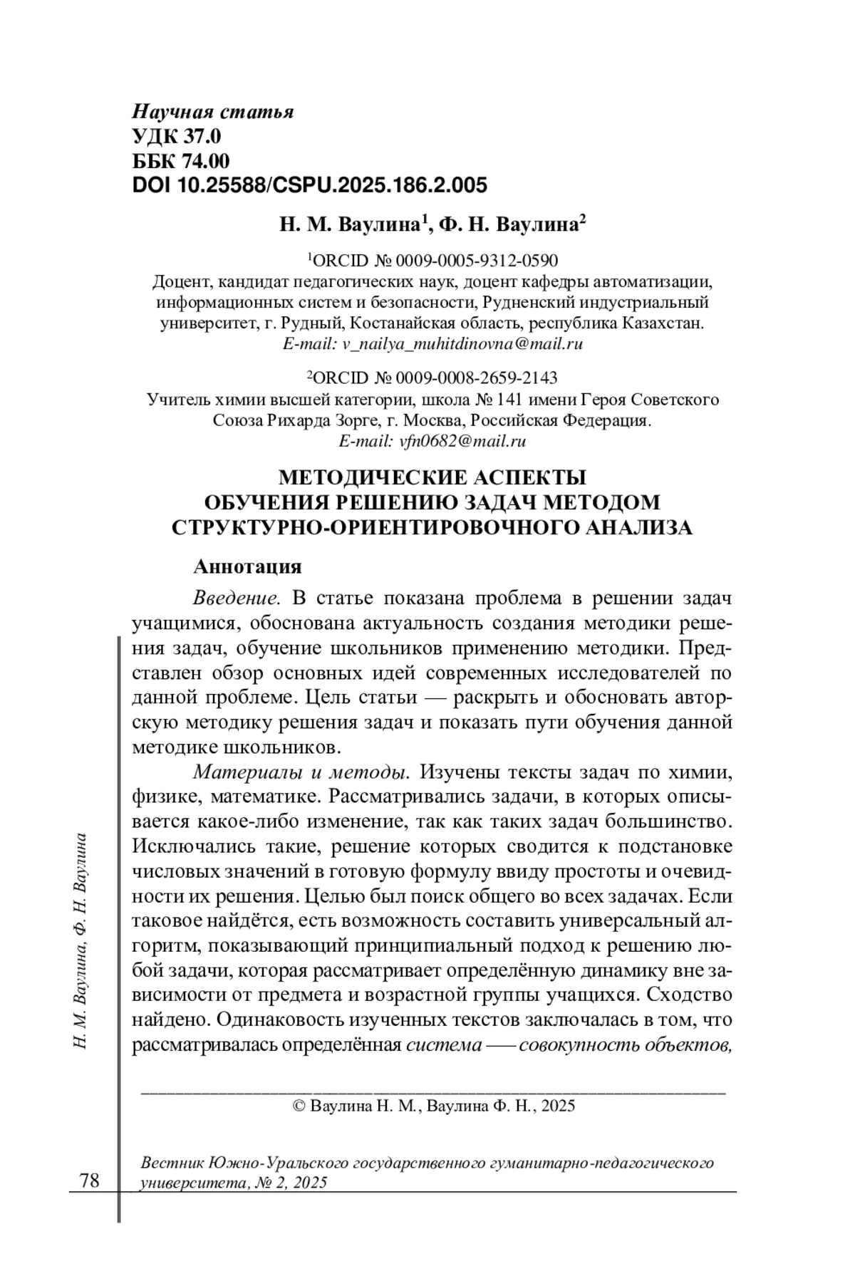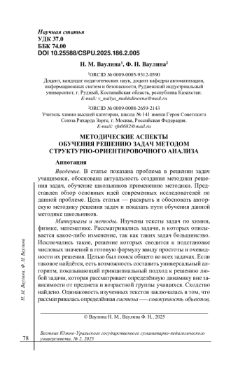 ВАУЛИНА Н. М., ВАУЛИНА Ф. Н. МЕТОДИЧЕСКИЕ АСПЕКТЫ ОБУЧЕНИЯ РЕШЕНИЮ ЗАДАЧ МЕТОДОМ СТРУКТУРНО-ОРИЕНТИРОВОЧНОГО АНАЛИЗА // ВЕСТНИК ЮЖНО-УРАЛЬСКОГО ГОСУДАРСТВЕННОГО ГУМАНИТАРНО-ПЕДАГОГИЧЕСКОГО УНИВЕРСИТЕТА. 2025. № 2 (186)