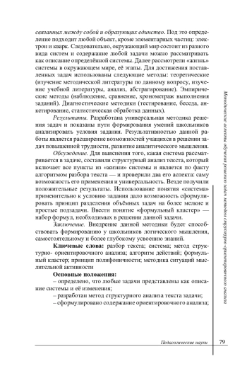 Заключение. Внедрение данной методики будет способствовать формированию у школьников логического мышления, самостоятельному и более глубокому усвоению знаний. Основные положения: - определено, что любые задачи представлены как описание системы и её изменения; - разработан метод структурного анализа текста задачи; - сформулировано содержание ориентировочного анализа; - показана технология составления формульных кластеров - общего и конкретного; - описаны этапы процесса решения задач; - определен принцип разделения объёмных задач на более простые; - показаны пути обучения учащихся данной методике.