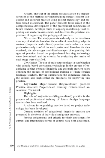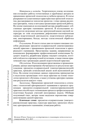 ВОЛОБУЕВА Ю. В., КОВАЛЕНКО А. В., СУРГАЙ Ю. В. ОРГАНИЗАЦИЯ ПРЕДМЕТНО-СОДЕРЖАТЕЛЬНОЙ (ЛИНГВОСТРАНОВЕДЧЕСКОЙ) ПРАКТИКИ ДЛЯ БУДУЩИХ УЧИТЕЛЕЙ ИНОСТРАННЫХ ЯЗЫКОВ НА ОСНОВЕ ПРОЕКТНОЙ ТЕХНОЛОГИИ // ВЕСТНИК ЮЖНО-УРАЛЬСКОГО ГОСУДАРСТВЕННОГО ГУМАНИТАРНО-ПЕДАГОГИЧЕСКОГО УНИВЕРСИТЕТА. 2025. № 2 (186)