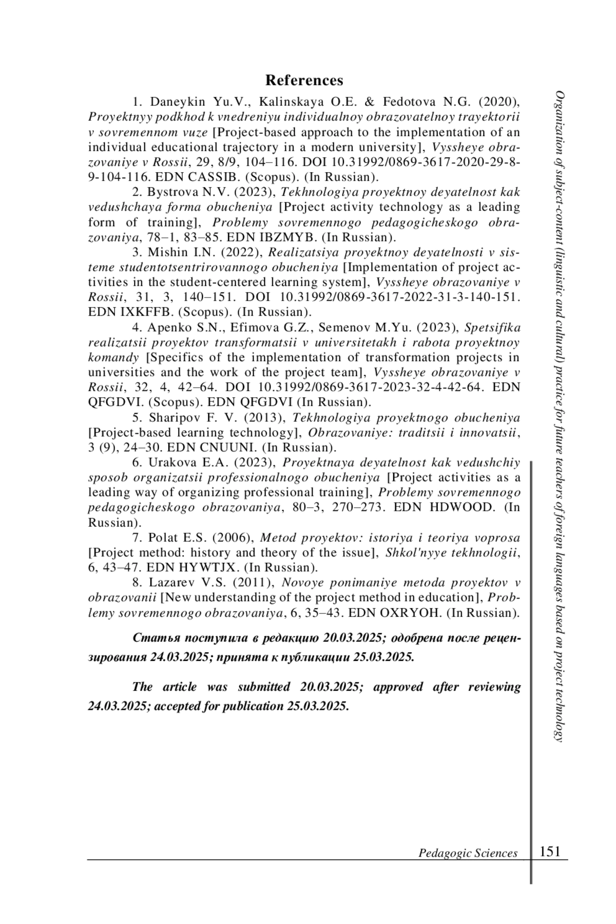 Статья: ОРГАНИЗАЦИЯ ПРЕДМЕТНО-СОДЕРЖАТЕЛЬНОЙ (ЛИНГВОСТРАНОВЕДЧЕСКОЙ) ПРАКТИКИ ДЛЯ БУДУЩИХ УЧИТЕЛЕЙ ИНОСТРАННЫХ ЯЗЫКОВ НА ОСНОВЕ ПРОЕКТНОЙ ТЕХНОЛОГИИ (2025)