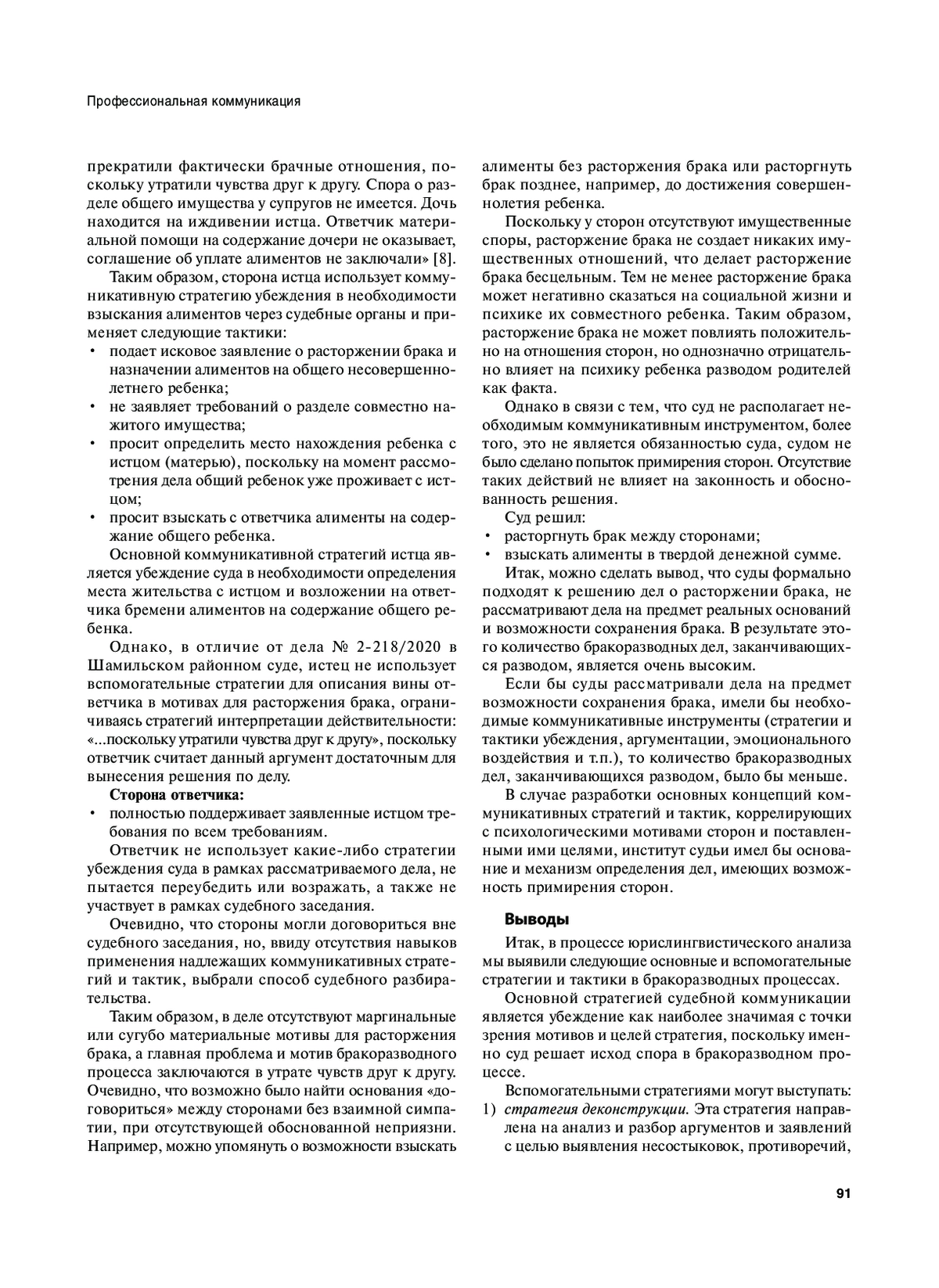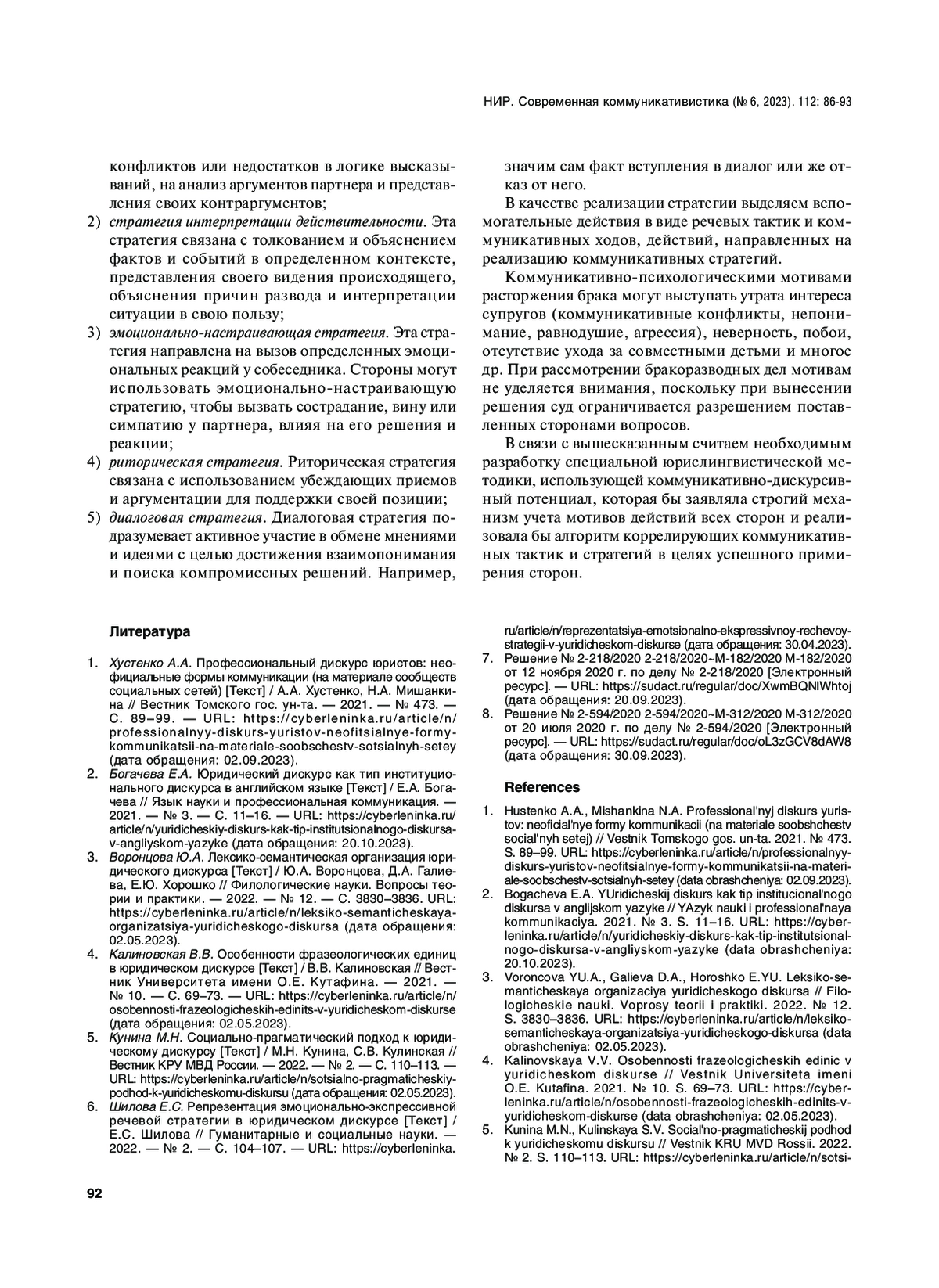 Статья: КОММУНИКАТИВНЫЕ ТАКТИКИ И СТРАТЕГИИ В БРАКОРАЗВОДНЫХ ПРОЦЕССАХ: ЮРИСЛИНГВИСТИЧЕСКИЙ АСПЕКТ (2023)