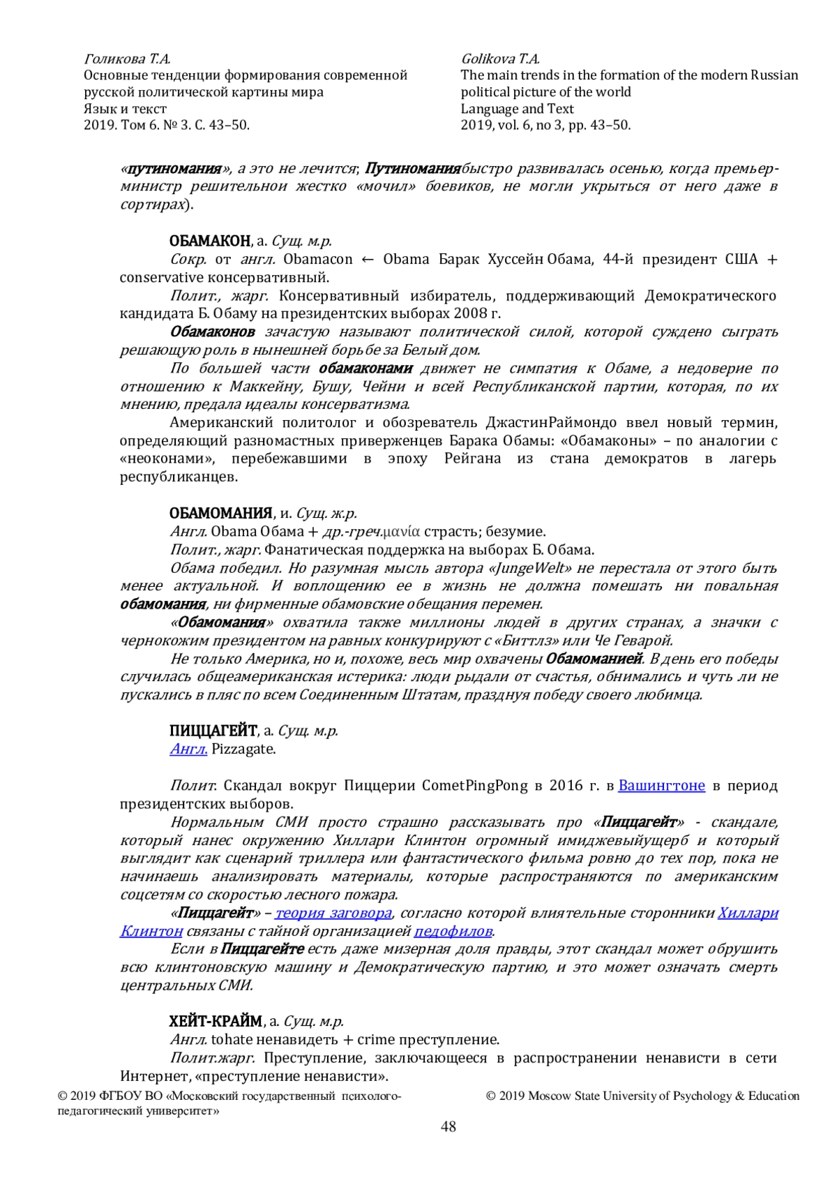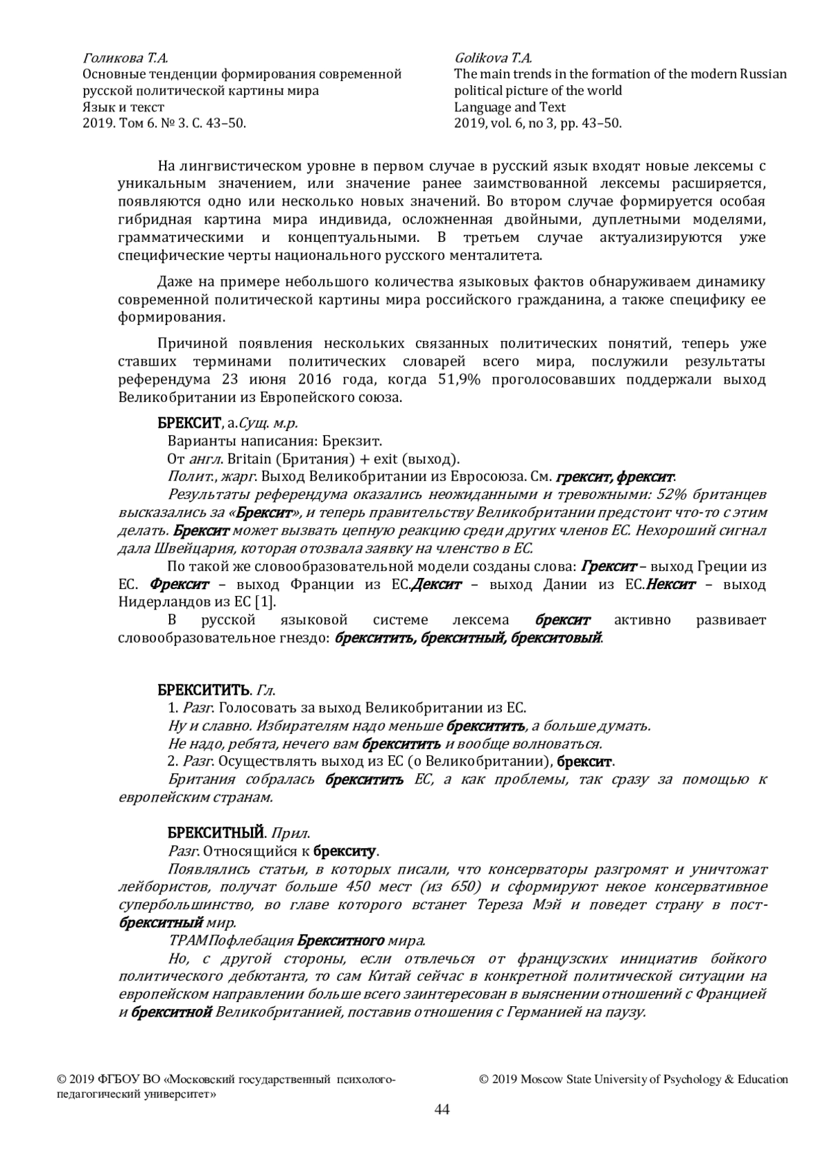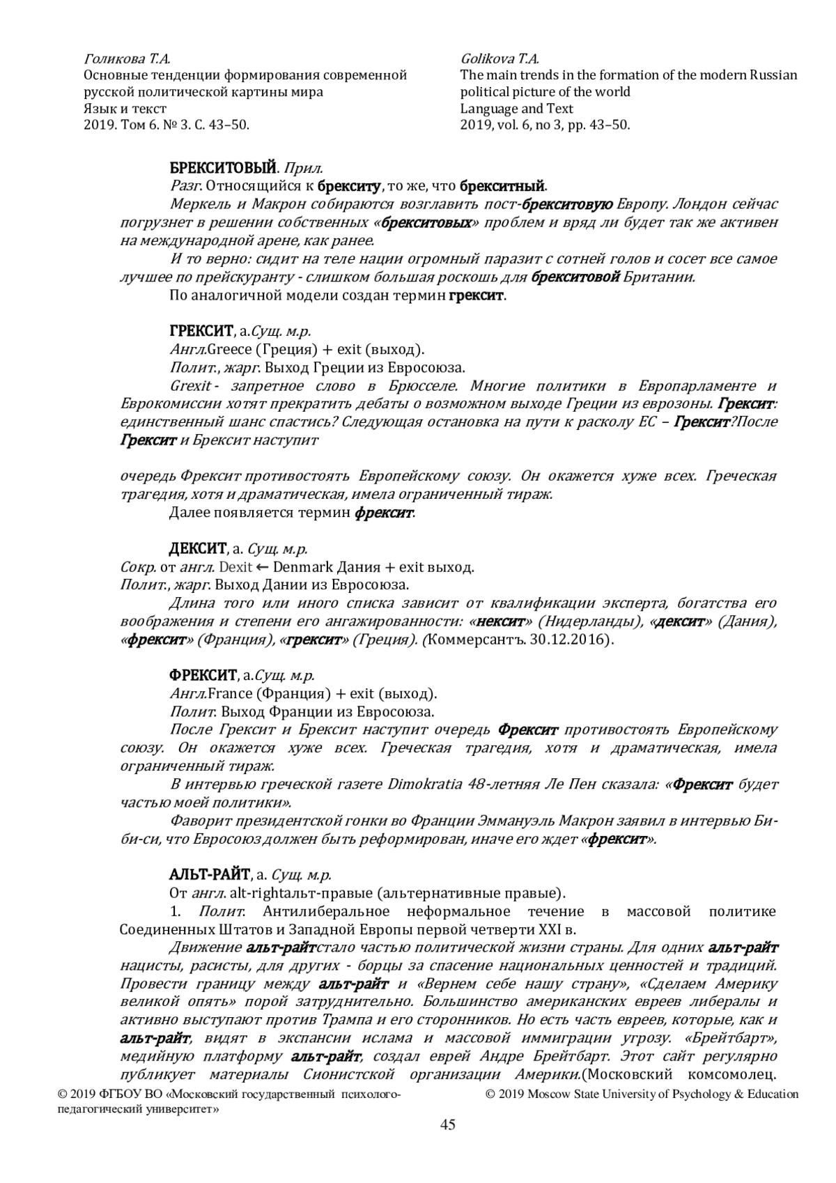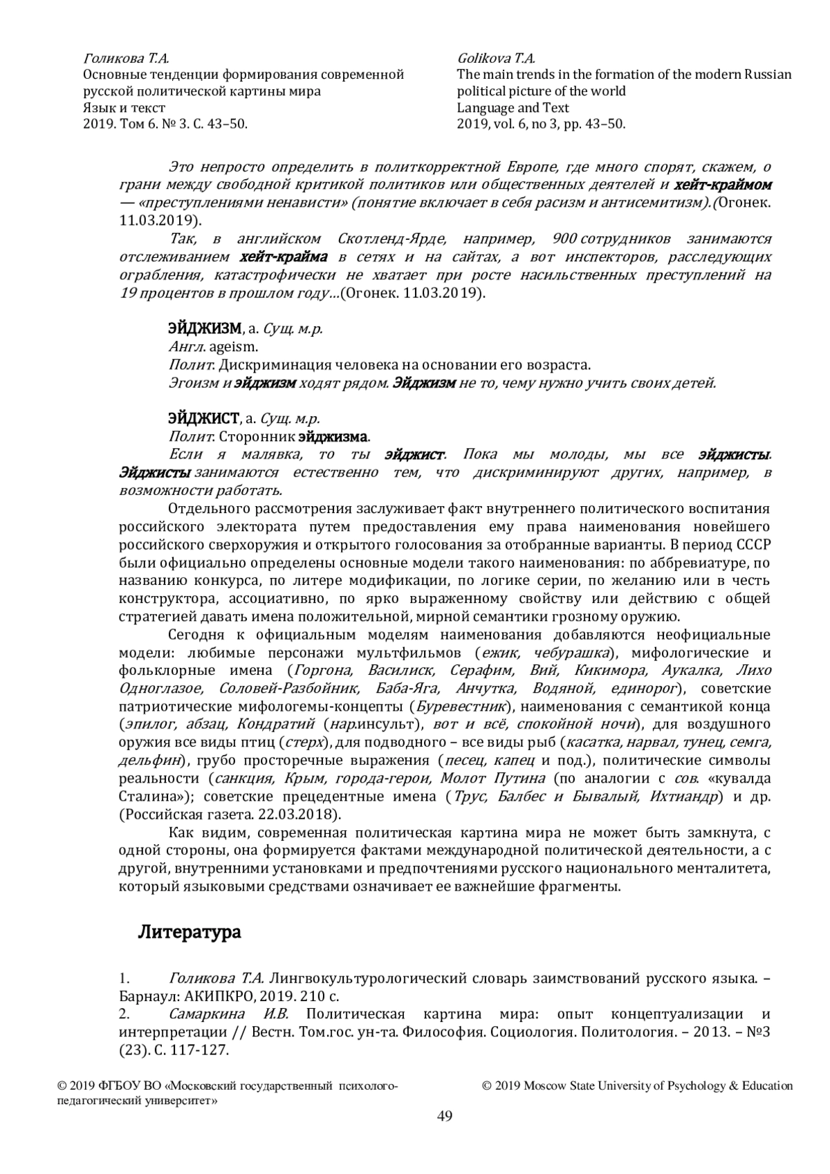 Голикова Т.А. Основные тенденции формирования современной русской политической картины мира [Электронный ресурс] // Язык и текст. 2019. Том 6. №3. C. 43-50. doi: 10.17759/langt.2019060305
