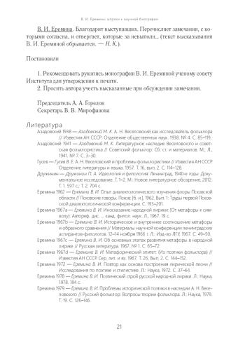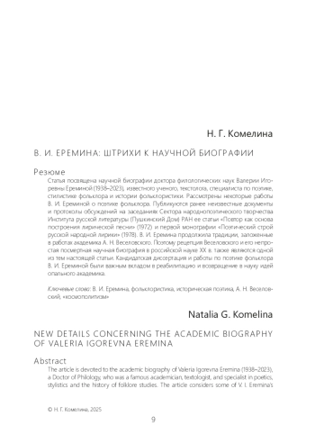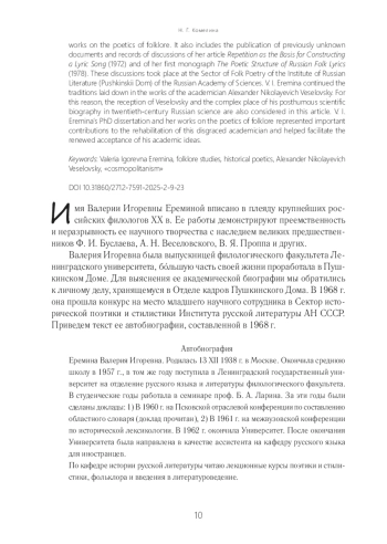 Статья посвящена научной биографии доктора филологических наук Валерии Игоревны Ереминой (1938–2023), известного ученого, текстолога, специалиста по поэтике, стилистике фольклора и истории фольклористики. Рассмотрены некоторые работы В. И. Ереминой о поэтике фольклора. Публикуются ранее неизвестные документы и протоколы обсуждений на заседаниях Сектора народнопоэтического творчества Института русской литературы (Пушкинский Дом) РАН ее статьи «Повтор как основа построения лирической песни» (1972) и первой монографии «Поэтический строй русской народной лирики» (1978). В. И. Еремина продолжила традиции, заложенные в работах академика А. Н. Веселовского. Поэтому рецепция Веселовского и его непростая посмертная научная биография в российской науке ХХ в. также являются одной из тем настоящей статьи. Кандидатская диссертация и работы по поэтике фольклора В. И. Ереминой были важным вкладом в реабилитацию и возвращение в науку идей опального академика.