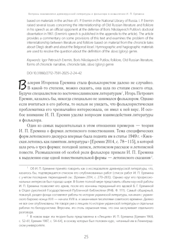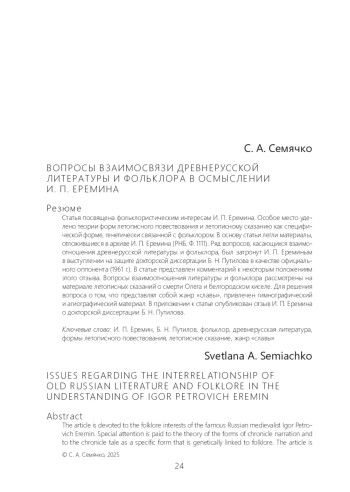 Статья посвящена фольклористическим интересам И. П. Еремина. Особое место уделено теории форм летописного повествования и летописному сказанию как специфической форме, генетически связанной с фольклором. В основу статьи легли материалы, отложившиеся в архиве И. П. Еремина (РНБ. Ф. 1111). Ряд вопросов, касающихся взаимоотношения древнерусской литературы и фольклора, был затронут И. П. Ереминым в выступлении на защите докторской диссертации Б. Н. Путилова в качестве официального оппонента (1961 г.). В статье представлен комментарий к некоторым положениям этого отзыва. Вопросы взаимоотношения литературы и фольклора рассмотрены на материале летописных сказаний о смерти Олега и белгородском киселе. Для решения вопроса о том, что представлял собой жанр «славы», привлечен гимнографический и агиографический материал. В приложении к статье опубликован отзыв И. П. Еремина о докторской диссертации Б. Н. Путилова