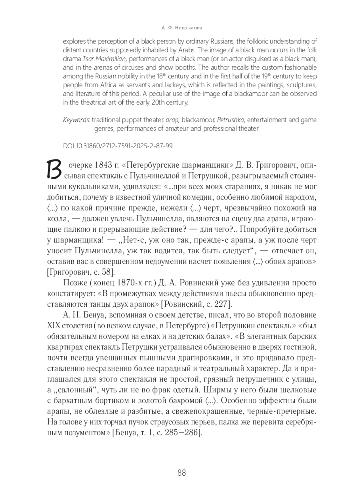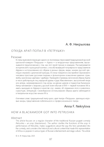 В статье выясняются функции одного из постоянных персонажей традиционной русской кукольной комедии «Петрушка» — Арапа — в петрушечных представлениях, высказываются предположения о том, как этот герой проник в комедию. Рассматривается исторический и культурный контекст, способствовавший популярности представителя Африки и использованию его образа в разных сферах, видах, жанрах русской зрелищно-игровой, сценической культуры. В статье говорится о восприятии чернокожего человека простыми русскими людьми и фольклорном осмыслении далеких стран, якобы населенных арапами / арабами. Приводятся примеры включения образа Арапа в число действующих лиц народной драмы «Царь Максимилиан», выступлений негра или актера, загримированного под негра, на аренах цирков и подмостках балаганов. Автор напоминает о модном у русской знати обычае в XVIII — первой половине XIX в. иметь выходцев из Африки в качестве слуг, лакеев, об отражении этого в живописи, скульптуре, литературе. Своеобразное использование образа арапа наблюдается в театральном искусстве начала XX в