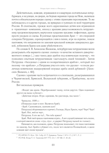 В очерке 1843 г. «Петербургские шарманщики» Д. В. Григорович, описывая спектакль с Пульчинеллой и Петрушкой, разыгрываемый столичными кукольниками, удивлялся: «… при всех моих стараниях, я никак не мог добиться, почему в известной уличной комедии, особенно любимой народом, 〈…〉 по какой причине прежде, нежели 〈…〉 черт, чрезвычайно похожий на козла, — должен увлечь Пульчинелла, являются на сцену два арапа, играю‑ щие палкою и прерывающие действие? — для чего?.. Попробуйте добиться у шарманщика! — „Нет‑с, уж оно так, прежде‑c арапы, а уж после черт уносит Пульчинелла, уж так водится, так быть следует“, — отвечает он, оставив вас в совершенном недоумении насчет появления 〈…〉 обоих арапов» [Григорович, с. 58].