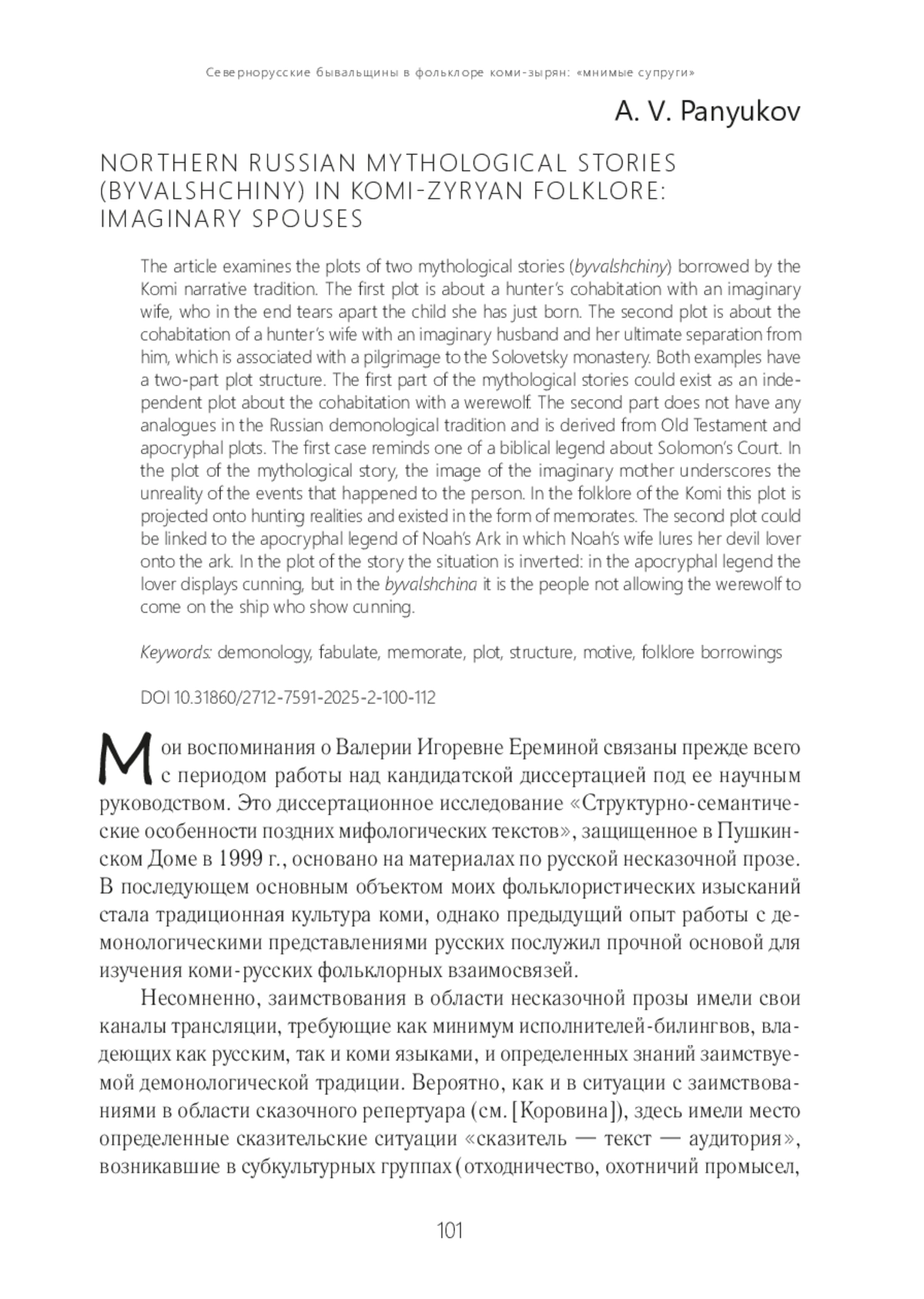 Мои воспоминания о Валерии Игоревне Ереминой связаны прежде всего с периодом работы над кандидатской диссертацией под ее научным руководством. Это диссертационное исследование «Структурно‑семантические особенности поздних мифологических текстов», защищенное в Пушкин‑ ском Доме в 1999 г., основано на материалах по русской несказочной прозе. В последующем основным объектом моих фольклористических изысканий стала традиционная культура коми, однако предыдущий опыт работы с де‑ монологическими представлениями русских послужил прочной основой для изучения коми‑русских фольклорных взаимосвязей.