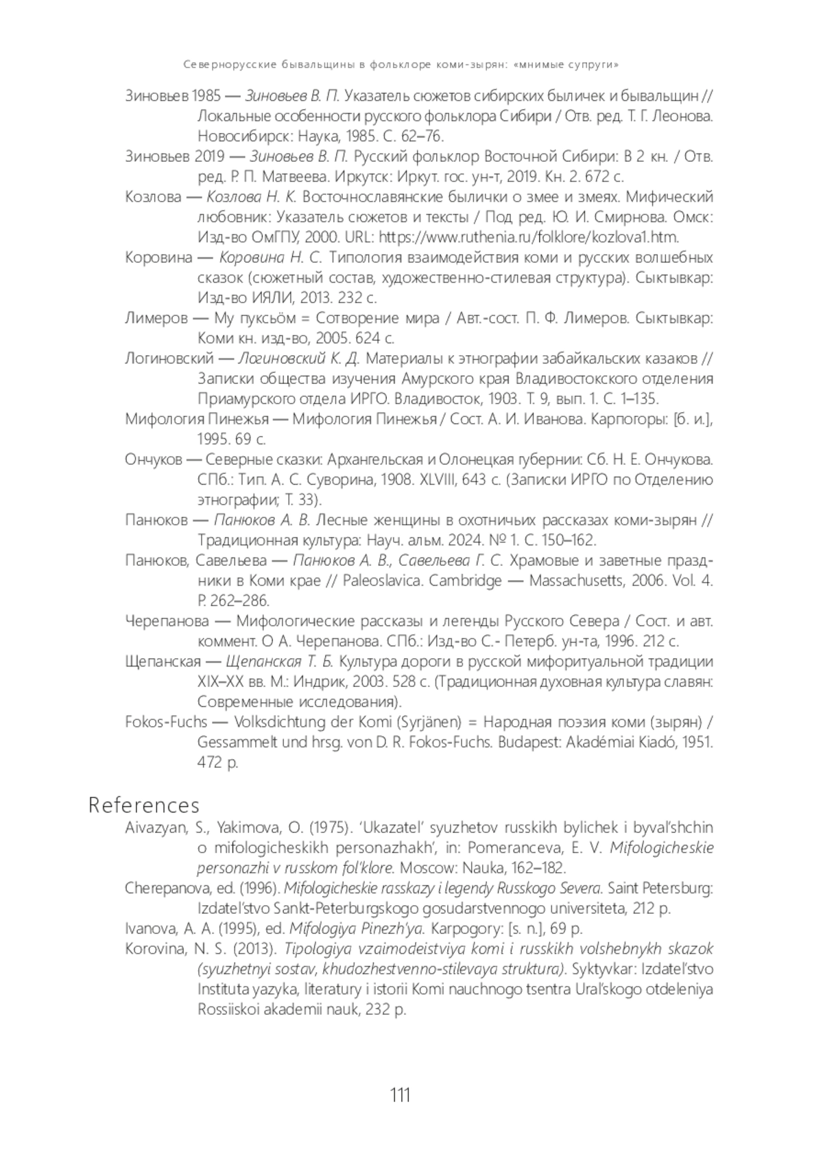 12. Панюков А. В. Лесные женщины в охотничьих рассказах коми-зырян // Традиционная культура: Науч. альм. 2024. № 1. С. 150-162.
