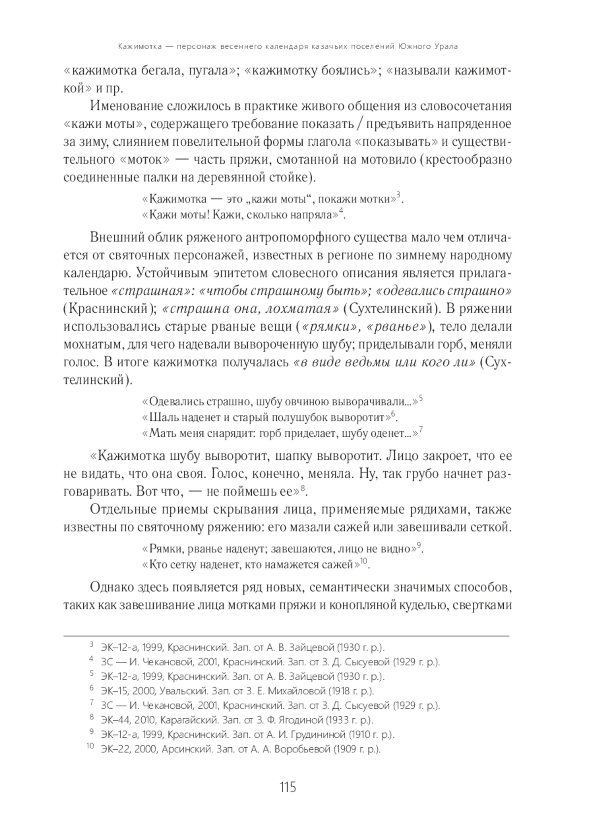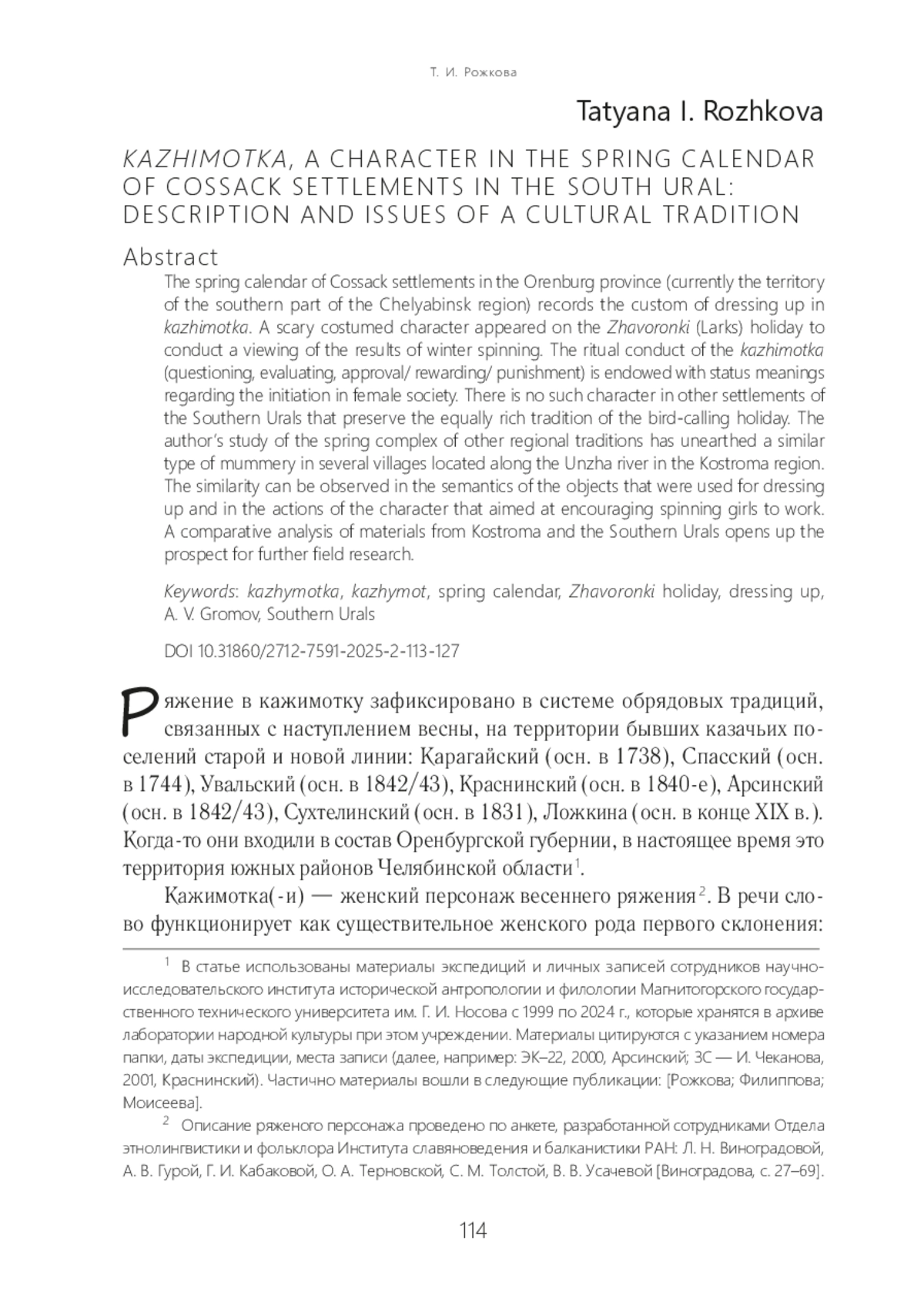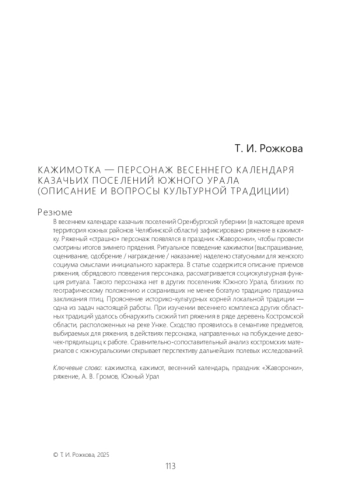 В весеннем календаре казачьих поселений Оренбургской губернии (в настоящее время территория южных районов Челябинской области) зафиксировано ряжение в кажимотку. Ряженый «страшно» персонаж появлялся в праздник «Жаворонки», чтобы провести смотрины итогов зимнего прядения. Ритуальное поведение кажимотки (выспрашивание, оценивание, одобрение / награждение / наказание) наделено статусными для женского социума смыслами инициального характера. В статье содержится описание приемов ряжения, обрядового поведения персонажа, рассматривается социокультурная функция ритуала. Такого персонажа нет в других поселениях Южного Урала, близких по географическому положению и сохранивших не менее богатую традицию праздника закликания птиц. Прояснение историко-культурных корней локальной традиции — одна из задач настоящей работы. При изучении весеннего комплекса других областных традиций удалось обнаружить схожий тип ряжения в ряде деревень Костромской области, расположенных на реке Унже. Сходство проявилось в семантике предметов, выбираемых для ряжения, в действиях персонажа, направленных на побуждение девочек-прядильщиц к работе. Сравнительно-сопоставительный анализ костромских материалов с южноуральскими открывает перспективу дальнейших полевых исследований