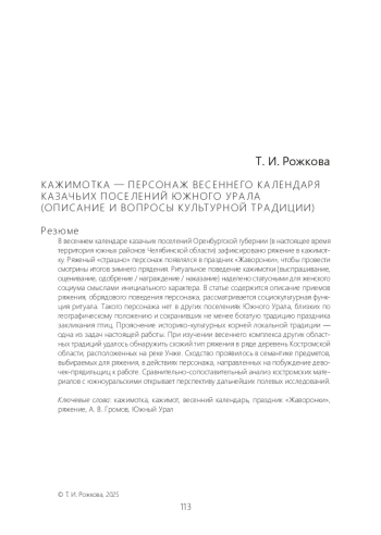 14. Рожкова Т. И. Некоторые аспекты изучения традиционной культуры русских Южноуральского региона // Русский фольклор: Материалы и исследования. СПб.: Наука, 2004. Т. 32. С. 265-282. EDN: XGIWZZ