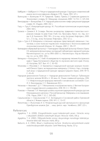 1. Агапкина Т. А. Этнографические связи календарных песен: Встреча весны в обрядах и фольклоре восточных славян. М.: Индрик, 2000. 336 с. EDN: UCFKTX