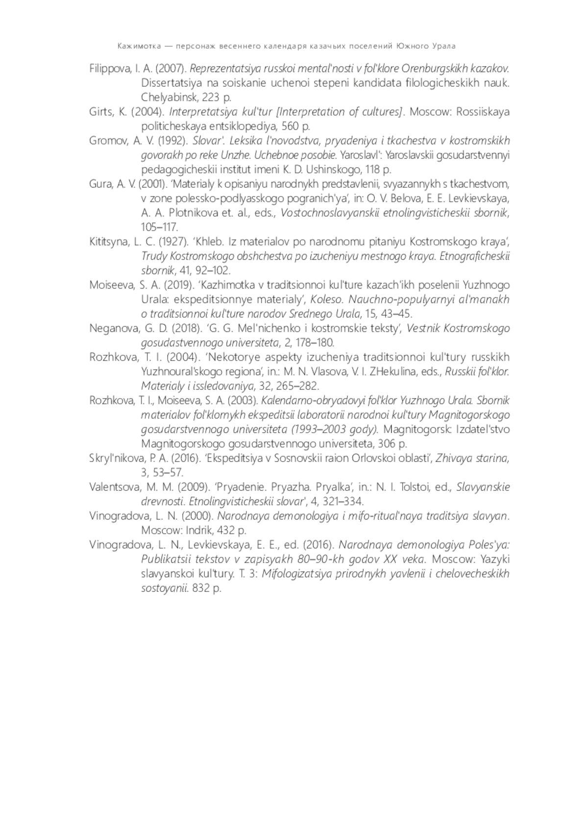 11. Моисеева С. А. Кажимотка в традиционной культуре казачьих поселе ний Южного Урала: экспедиционные материалы // Колесо: Науч.-популяр ный альм. о традиционной культуре народов Среднего Урала. 2019. № 15. С. 43-45.