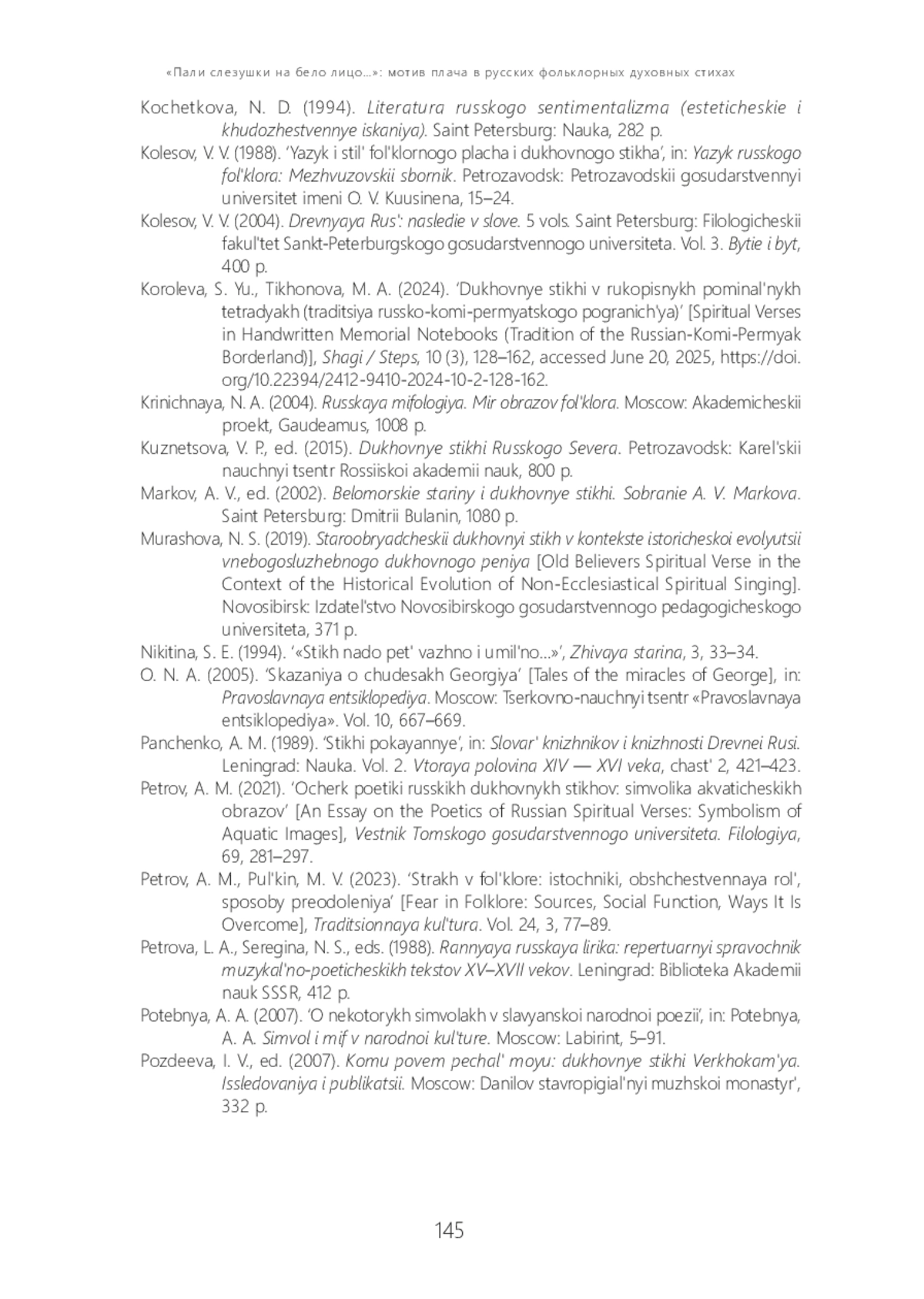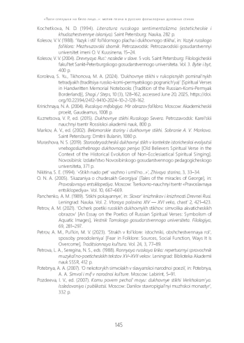 13. Королёва С. Ю., Тихонова М. А. Духовные стихи в рукописных поминальных тетрадях (традиция русско-коми-пермяцкого пограничья) // Шаги / Steps. 2024. Т. 10, № 3. С. 128-162. DOI: 10.22394/2412-9410-2024-10-2-128-162 EDN: FCPIQU