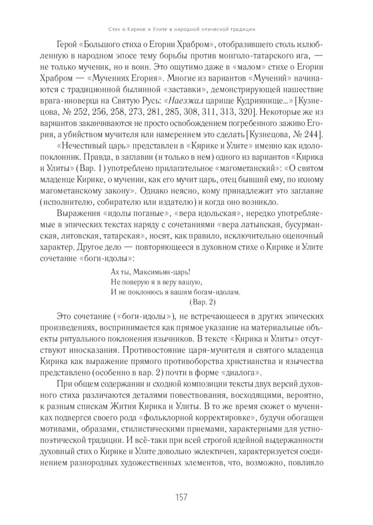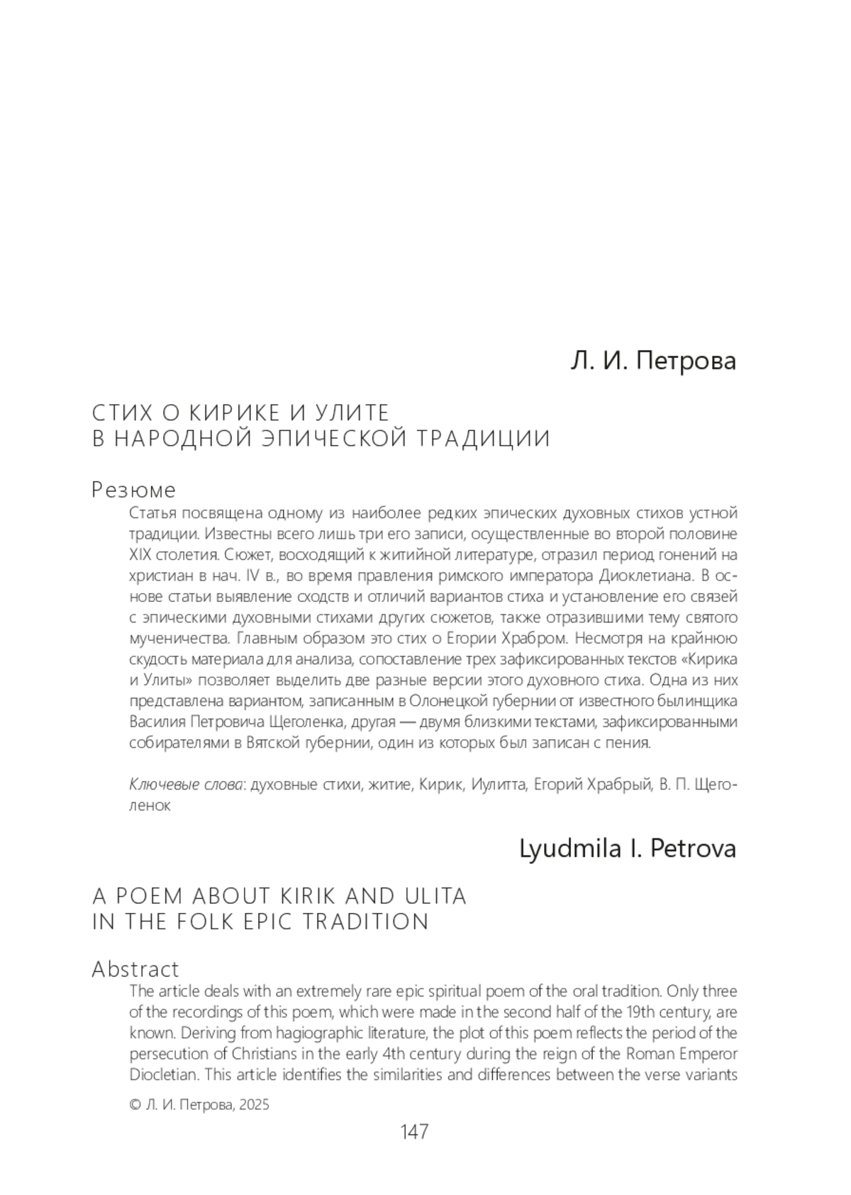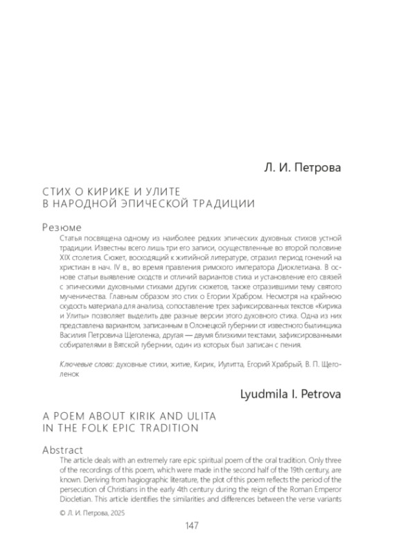 Статья посвящена одному из наиболее редких эпических духовных стихов устной традиции. Известны всего лишь три его записи, осуществленные во второй половине XIX столетия. Сюжет, восходящий к житийной литературе, отразил период гонений на христиан в нач. IV в., во время правления римского императора Диоклетиана. В основе статьи выявление сходств и отличий вариантов стиха и установление его связей с эпическими духовными стихами других сюжетов, также отразившими тему святого мученичества. Главным образом это стих о Егории Храбром. Несмотря на крайнюю скудость материала для анализа, сопоставление трех зафиксированных текстов «Кирика и Улиты» позволяет выделить две разные версии этого духовного стиха. Одна из них представлена вариантом, записанным в Олонецкой губернии от известного былинщика Василия Петровича Щеголенка, другая — двумя близкими текстами, зафиксированными собирателями в Вятской губернии, один из которых был записан с пения.
