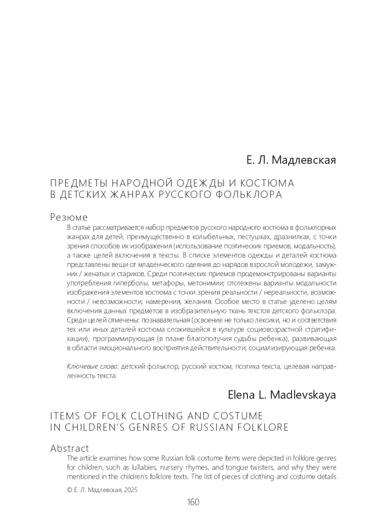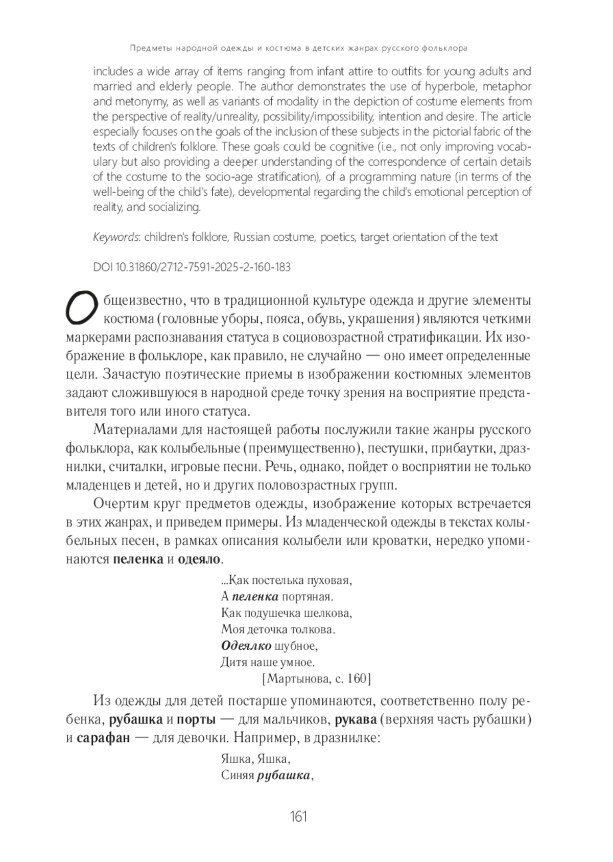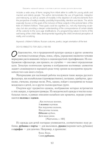 В статье рассматривается набор предметов русского народного костюма в фольклорных жанрах для детей, преимущественно в колыбельных, пестушках, дразнилках, с точки зрения способов их изображения (использование поэтических приемов, модальность), а также целей включения в тексты. В списке элементов одежды и деталей костюма представлены вещи от младенческого одеяния до нарядов взрослой молодежи, замужних / женатых и стариков. Среди поэтических приемов продемонстрированы варианты употребления гиперболы, метафоры, метонимии; отслежены варианты модальности изображения элементов костюма с точки зрения реальности / нереальности, возможности / невозможности, намерения, желания. Особое место в статье уделено целям включения данных предметов в изобразительную ткань текстов детского фольклора. Среди целей отмечены: познавательная (освоение не только лексики, но и соответствия тех или иных деталей костюма сложившейся в культуре социовозрастной стратификации), программирующая (в плане благополучия судьбы ребенка), развивающая в области эмоционального восприятия действительности, социализирующая ребенка.