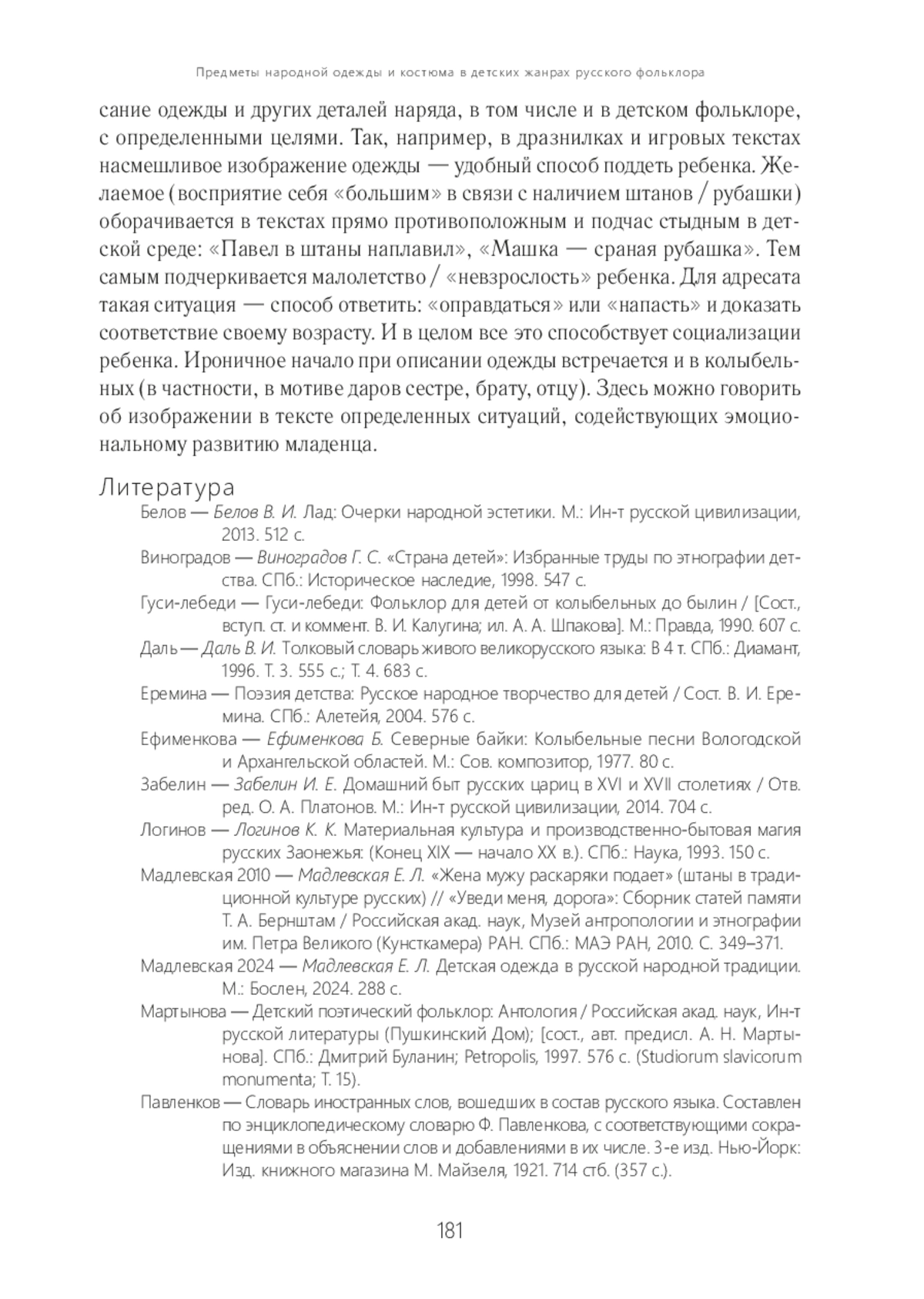 10. Мадлевская Е. Л. Детская одежда в русской народной традиции. М.: Бослен, 2024. 288 с.