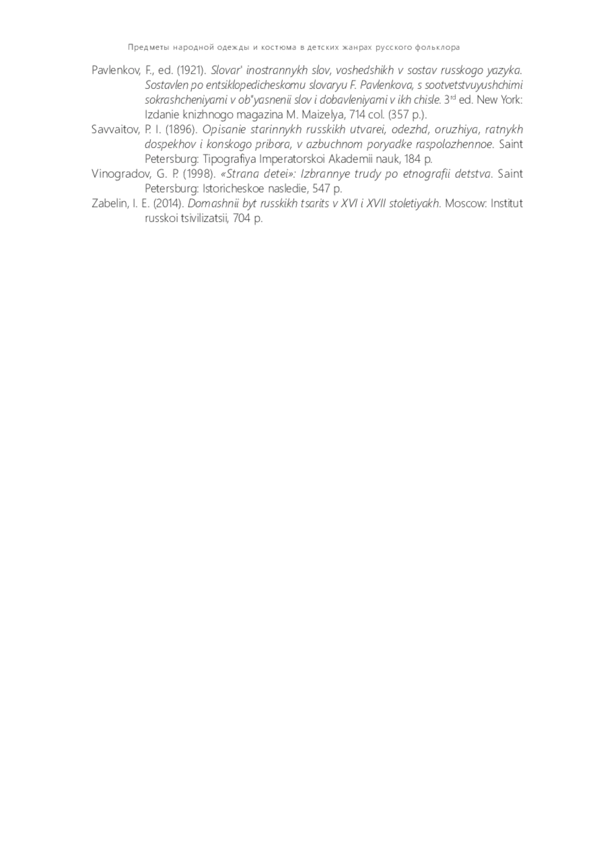 7. Забелин И. Е. Домашний быт русских цариц в XVI и XVII столетиях / Отв. ред. О. А. Платонов. М.: Ин-т русской цивилизации, 2014. 704 с.