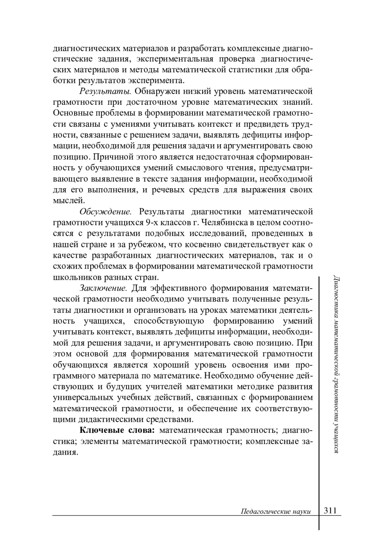 Заключение. Для эффективного формирования математической грамотности необходимо учитывать полученные результаты диагностики и организовать на уроках математики деятельность учащихся, способствующую формированию умений учитывать контекст, выявлять дефициты информации, необходимой для решения задачи, и аргументировать свою позицию. При этом основой для формирования математической грамотности обучающихся является хороший уровень освоения ими программного материала по математике. Необходимо обучение действующих и будущих учителей математики методике развития универсальных учебных действий, связанных с формированием математической грамотности, и обеспечение их соответствующими дидактическими средствами. Основные положения: - в разработке средств диагностики математической грамотности российских школьников целесообразно ориентироваться на представленные в ФГОС ООО универсальные учебные действия обучающихся; - разработанные на основе анализа структуры математической грамотности комплексные задания диагностируют математические знания и умения и элементы собственно математической грамотности как способности применять математику в разнообразных практических ситуациях; - анализ результатов диагностики математической грамотности школьников позволил выявить причины их затруднений и сформулировать предложения по повышению математической грамотности школьников.