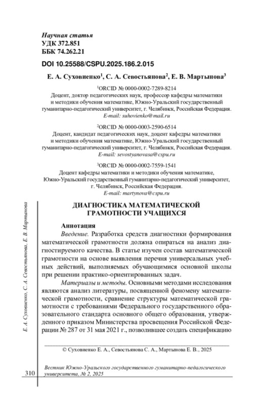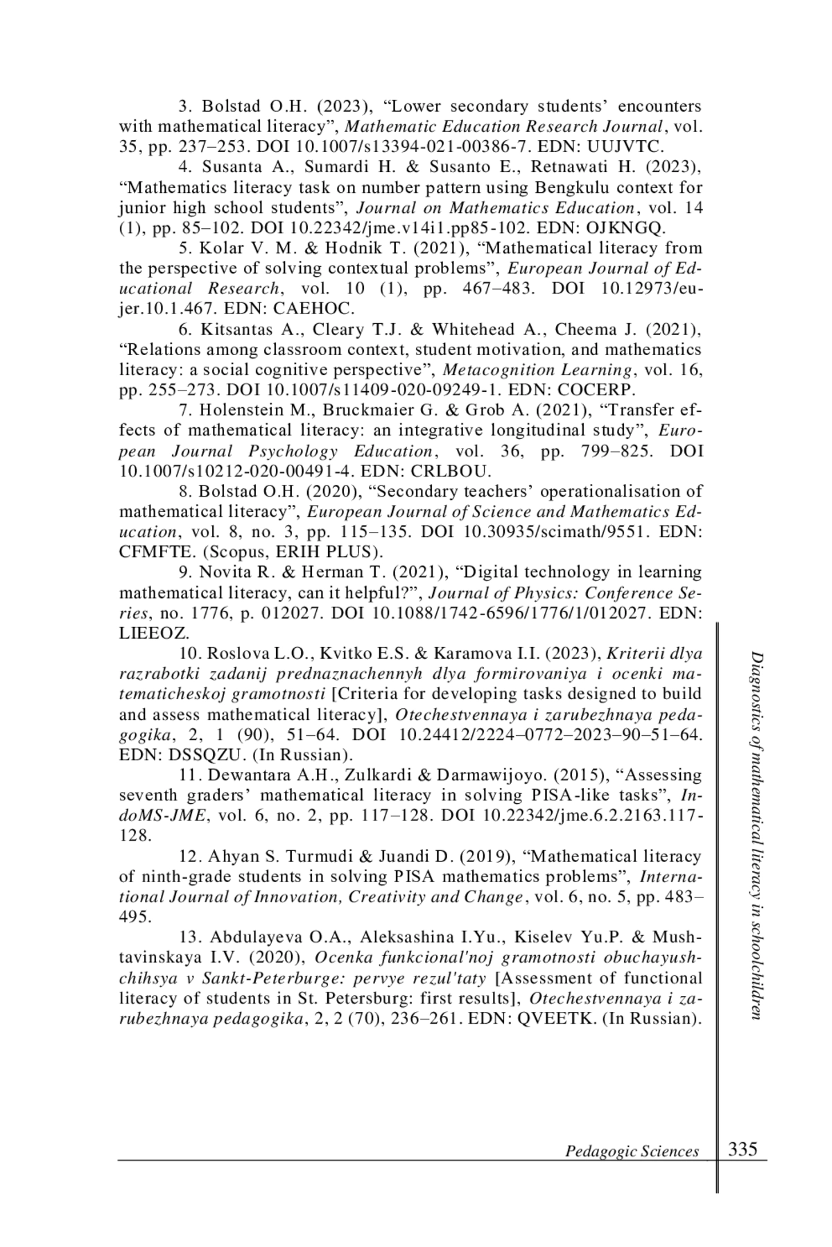 3. Bolstad O.H. (2023), “Lower secondary students’ encounters with mathematical literacy”, Mathematic Education Research Journal, vol. 35, pp. 237-253. DOI: 10.1007/s13394-021-00386-7 EDN: UUJVTC