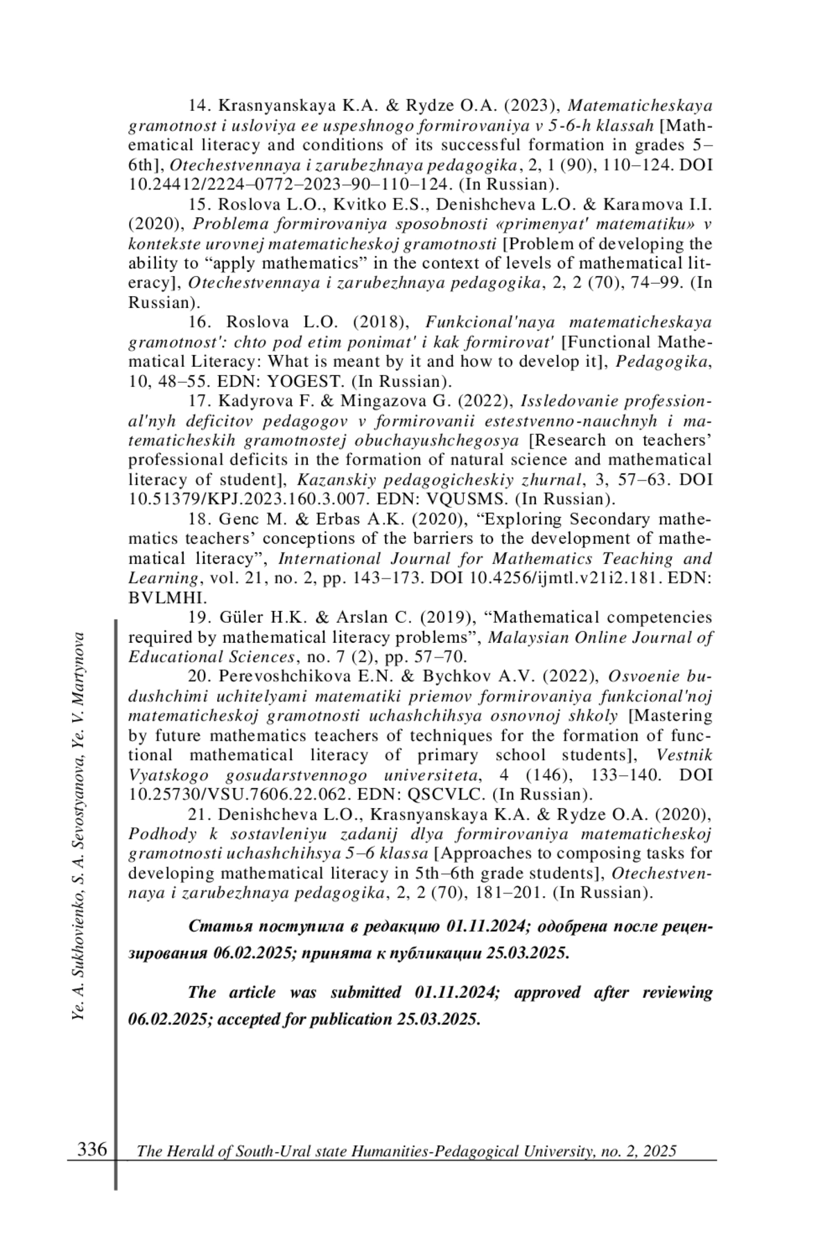 21. Денищева Л. О., Краснянская К. А., Рыдзе О. А. Подходы к составлению заданий для формирования математической грамотности учащихся 5-6 класса // Отечественная и зарубежная педагогика. 2020. Т. 2, № 2 (70). С. 181-201. EDN: HXZUPG