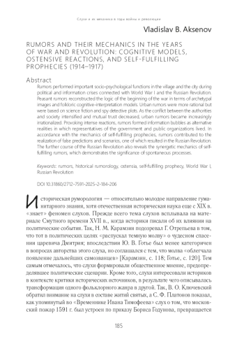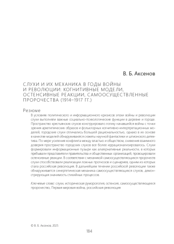 В условиях политического и информационного кризисов эпохи войны и революции слухи выполняли важные социально-психологические функции в деревне и городе. Пространство крестьянских слухов конструировало логику начавшейся войны с точки зрения архетипических образов и фольклорных когнитивно-интерпретационных моделей, городские слухи отличались большей рациональностью, однако в их основе в качестве моделей обнаруживаются сюжеты научной фантастики и шпионского детектива. По мере усиления конфликта между властью и обществом, снижения взаимного доверия пространство городских слухов все более иррационализировалось. Слухи формировали информационные пузыри как альтернативные реальности, в которых пребывали представители правительства и общественных организаций, провоцировали остенсивные реакции. В соответствии с механикой самоосуществляющихся пророчеств слухи способствовали реализации ложных прогнозов и сценариев, одним из которых стала российская революция. В дальнейшем течении российской революции также обнаруживается синергетическая механика самоосуществляющихся слухов, демонстрирующая значимость стихийных процессов