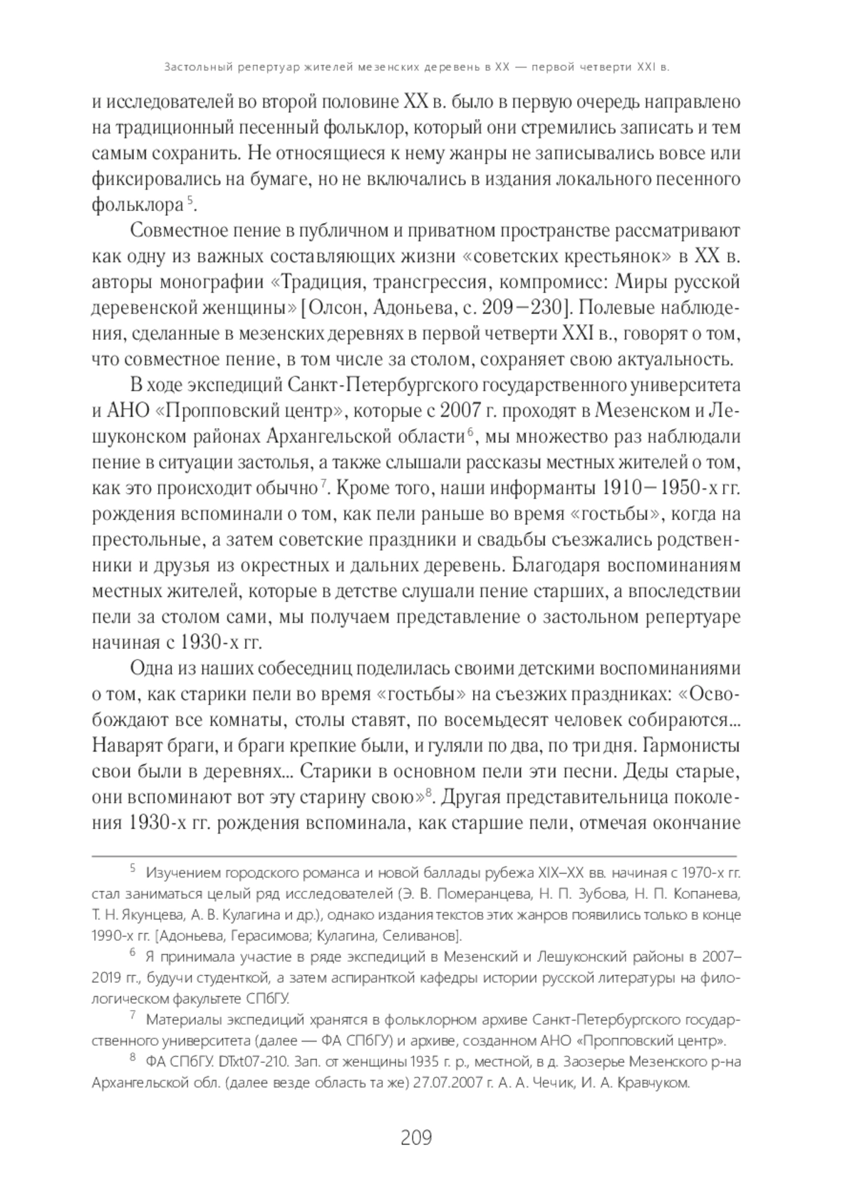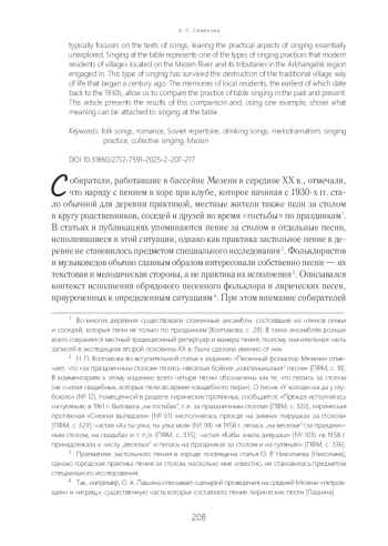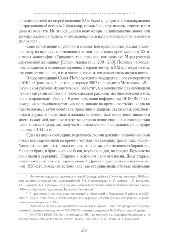 Собиратели, работавшие в бассейне Мезени в середине XX в., отмечали, что наряду с пением в хоре при клубе, которое начиная с 1930‑х гг. ста‑ ло обычной для деревни практикой, местные жители также пели за столом в кругу родственников, соседей и друзей во время «гостьбы» по праздникам 1. В статьях и публикациях упоминаются пение за столом и отдельные песни, исполнявшиеся в этой ситуации, однако как практика застольное пение в де‑ ревне не становилось предметом специального исследования 2. Фольклористов и музыковедов обычно главным образом интересовали собственно песни — их текстовая и мелодическая стороны, а не практика их исполнения 3. Описывался контекст исполнения обрядового песенного фольклора и лирических песен, приуроченных к определенным ситуациям