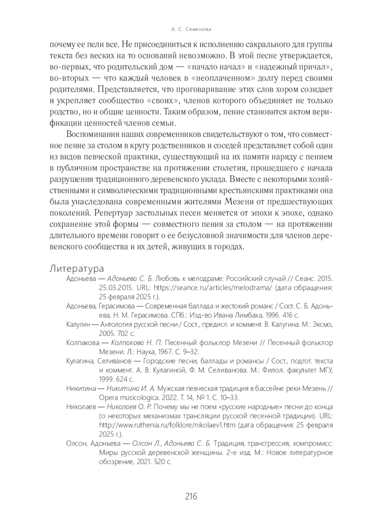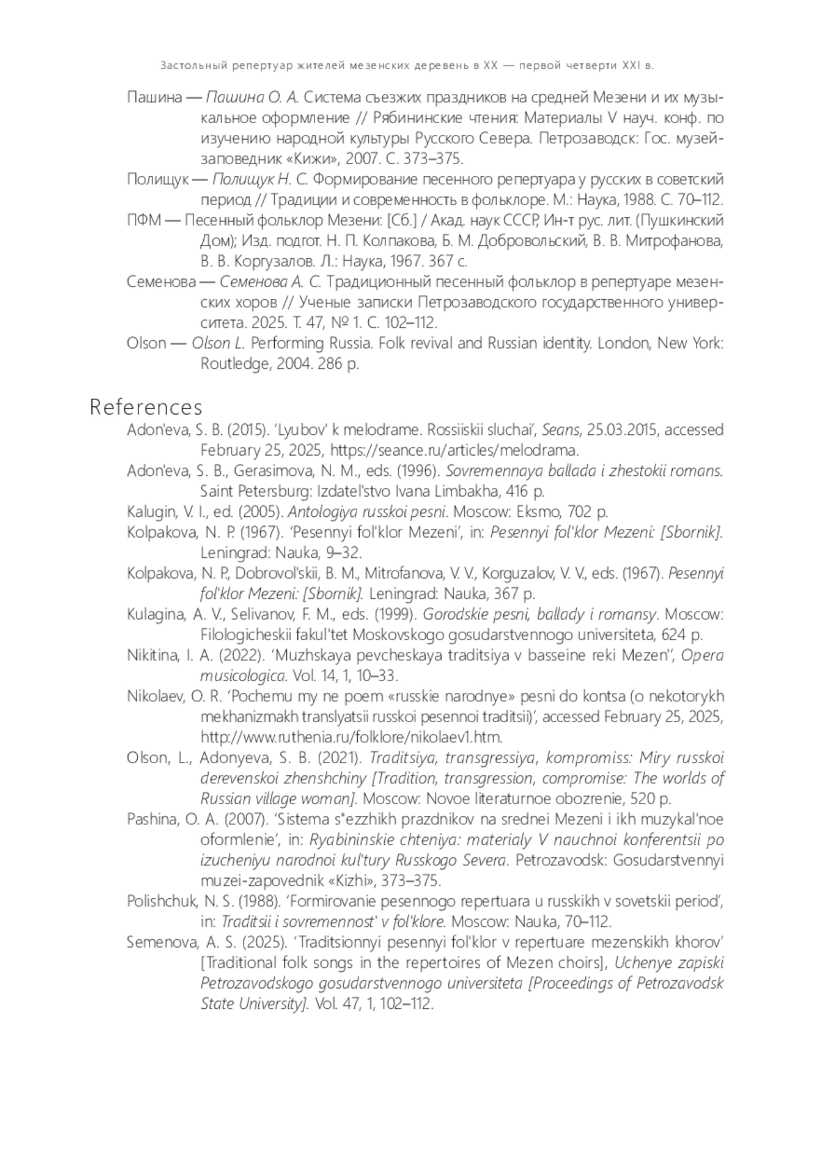 12. Семенова А. С. Традиционный песенный фольклор в репертуаре мезен ских хоров // Ученые записки Петрозаводского государственного универ ситета. 2025. Т. 47, № 1. С. 102-112.